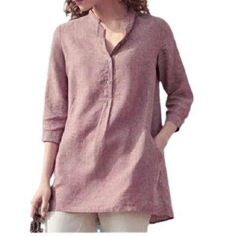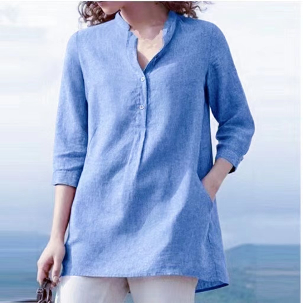 Cross-border Ebay 2020 Autumn New European and American Women’s Solid Color Seven-point Sleeve Collar Cotton and Linen Casual Pullover Shirt