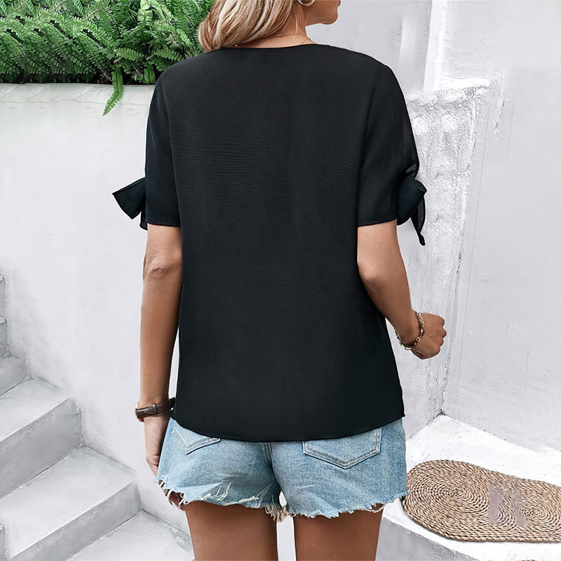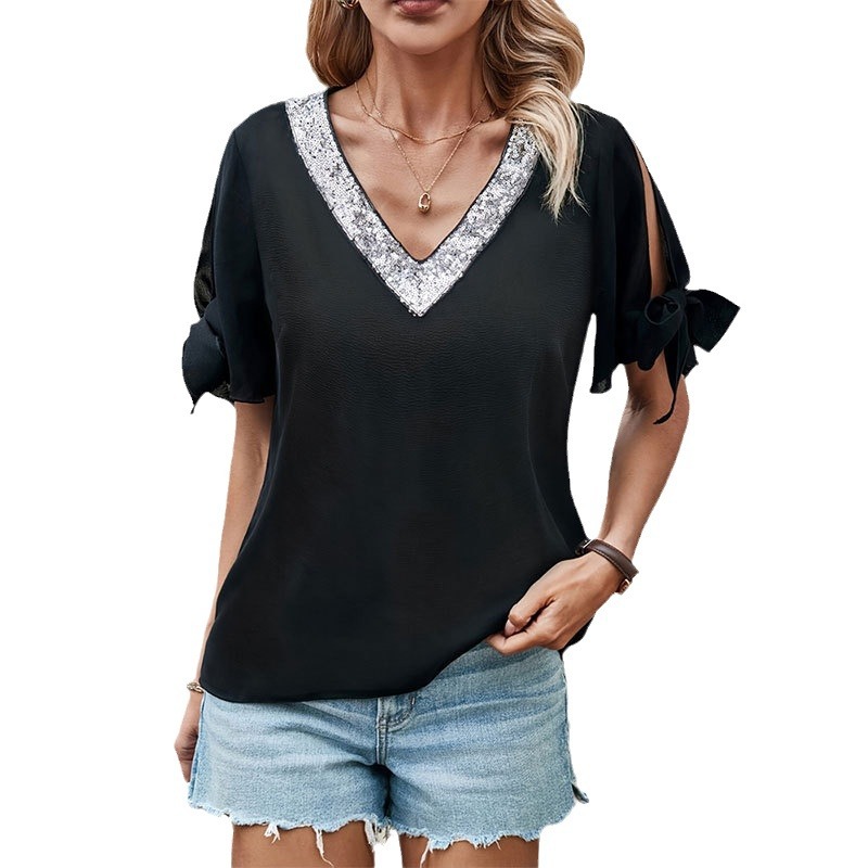 | nameOriginal | Cross-border Elegant Commuter V-neck Sequin Embellishment Hollow Design Strap Short-sleeved Shirt Women's Foreign Trade Loose T-shirt Women's Clothing |