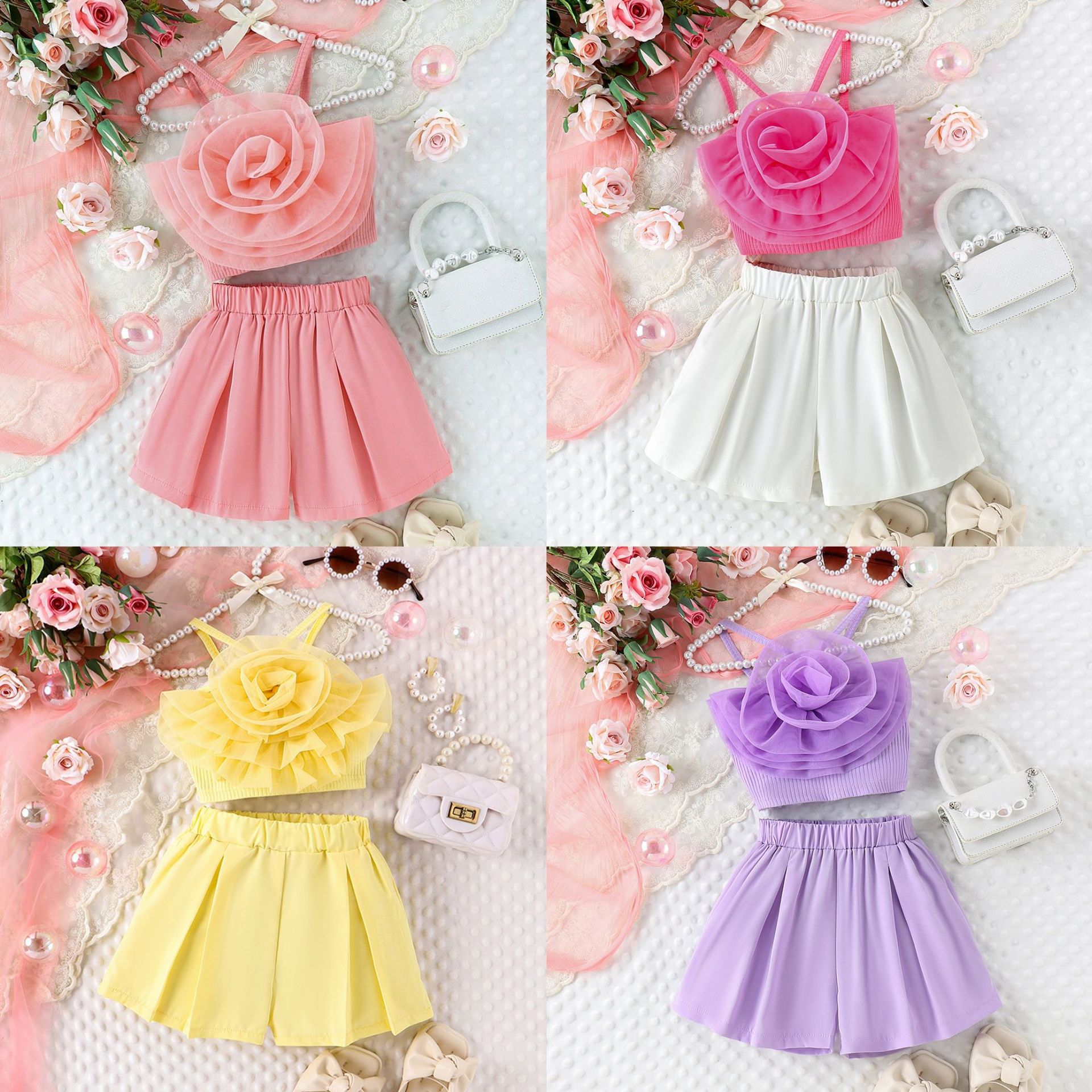 Cross-border Europe and the United States Summer Girls Children’s Suit Small and Medium-sized Children’s Three-dimensional Flower Sling Casual Shorts Fashion New Style