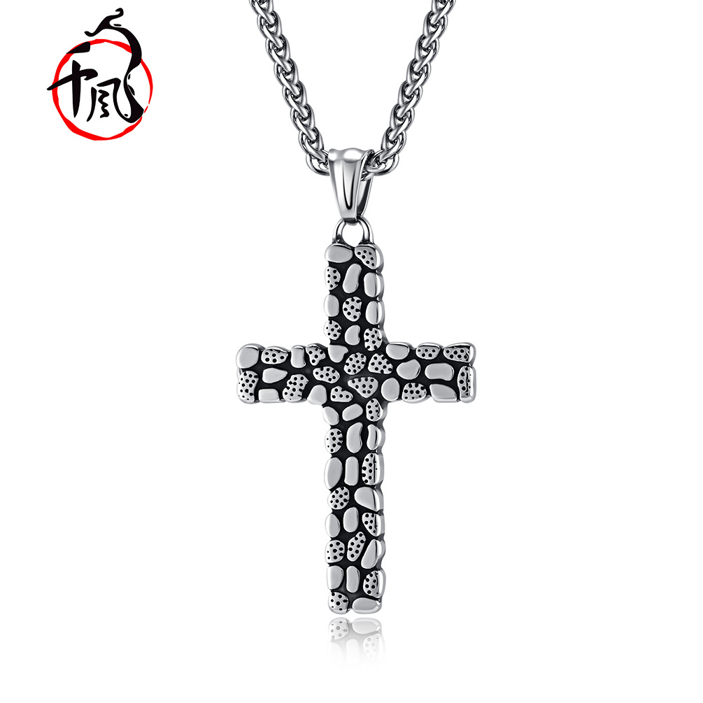 | nameOriginal | Cross-border European and American retro Pebble titanium steel cross necklace men's niche personality wear stone pendant |