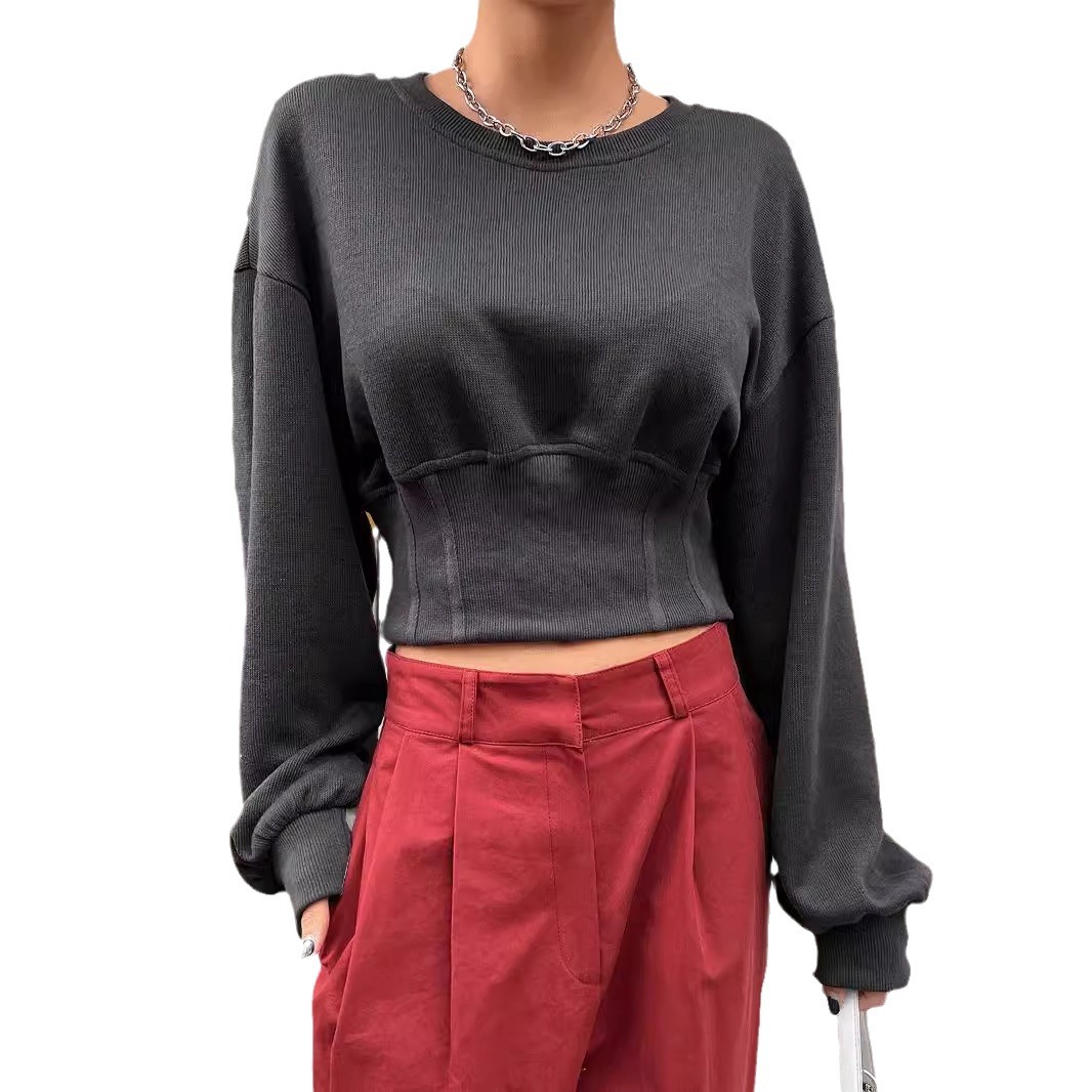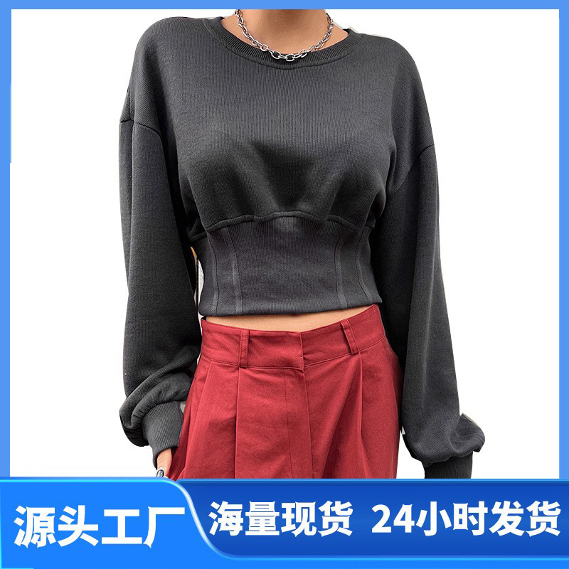 Cross-border European and American Short Waist Crewneck Sweat Women's Autumn Thin All-match Loose Slimming Hoodless Long-sleeved Top