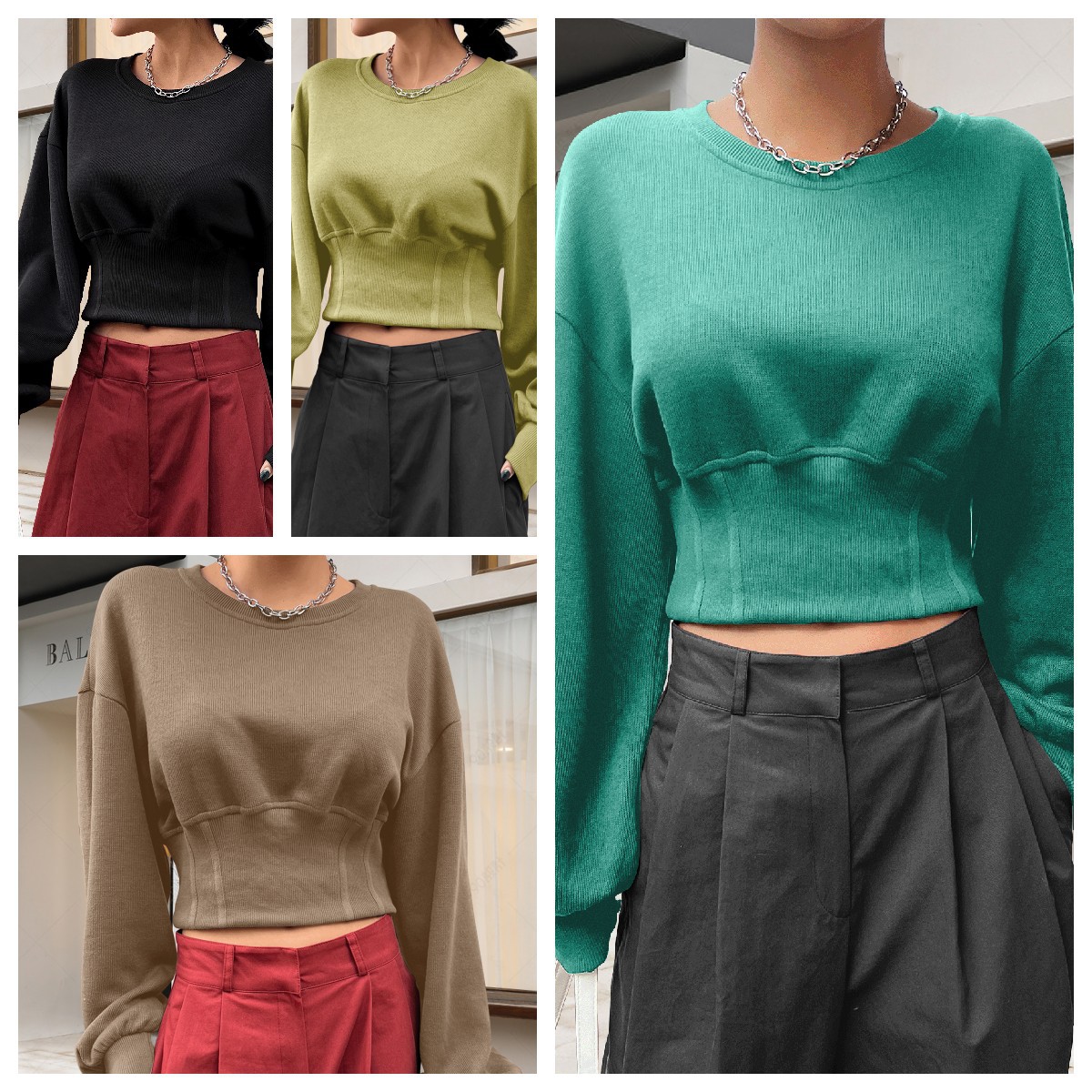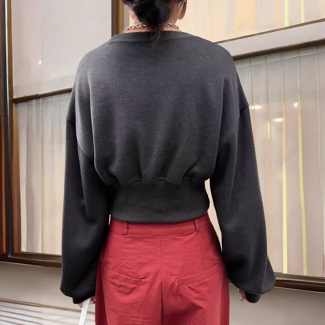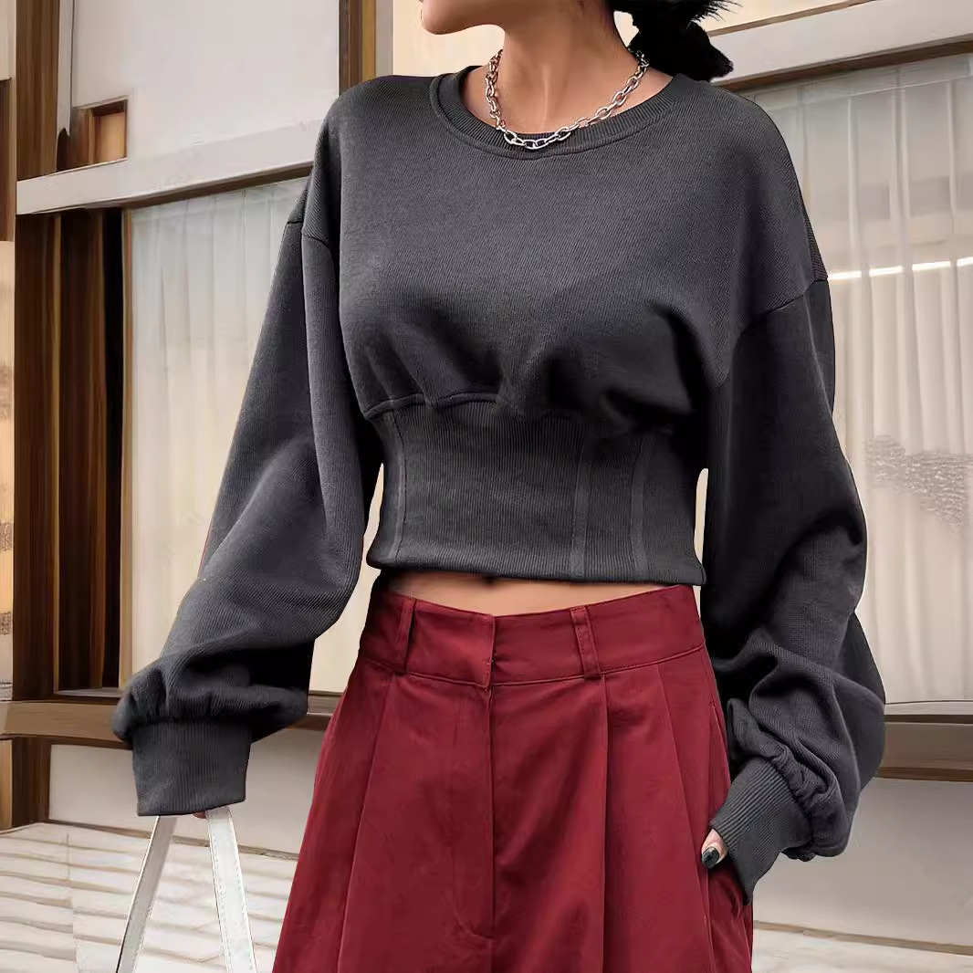 Cross-border European and American Short Waist Crewneck Sweat Women’s Autumn Thin All-match Loose Slimming Hoodless Long-sleeved Top