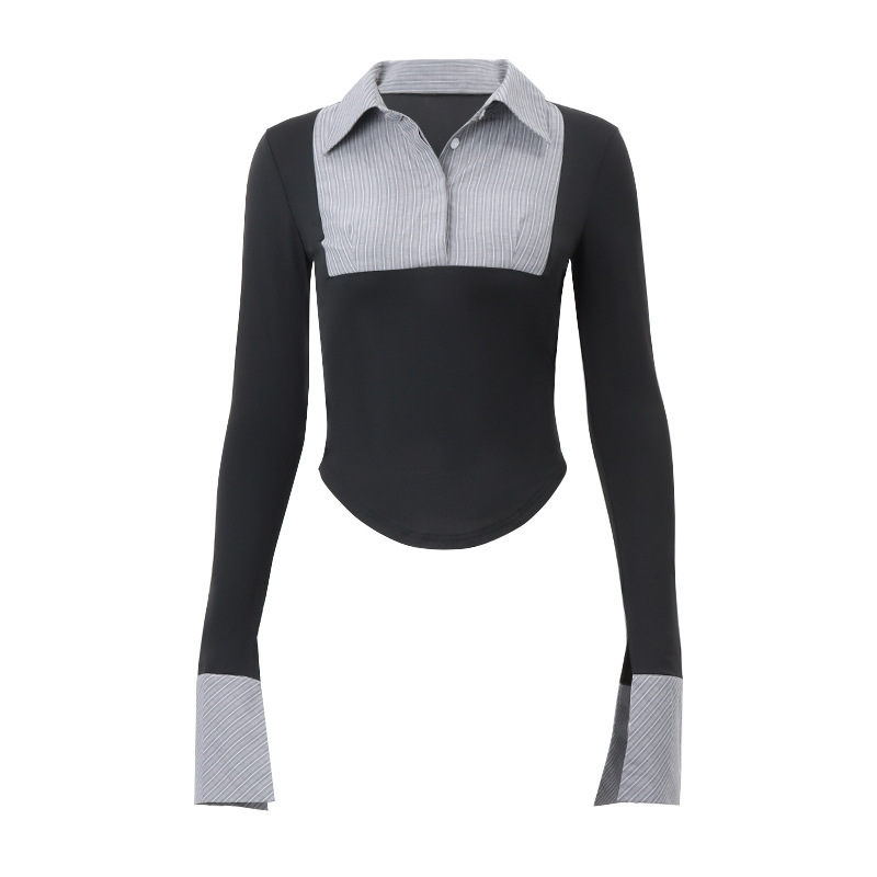 | nameOriginal | Cross-border European and American Women's 2023 Autumn Polo Collar Elegant Stripe Color Contrast Slim-fit All-match Long-sleeve Top for Women |