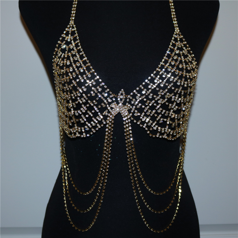 Cross-border Exaggerated Rhinestone Sling Bra Chain Tassel Belly Dance Waist Chain Sexy Flash Diamond Thong Body Chain Set