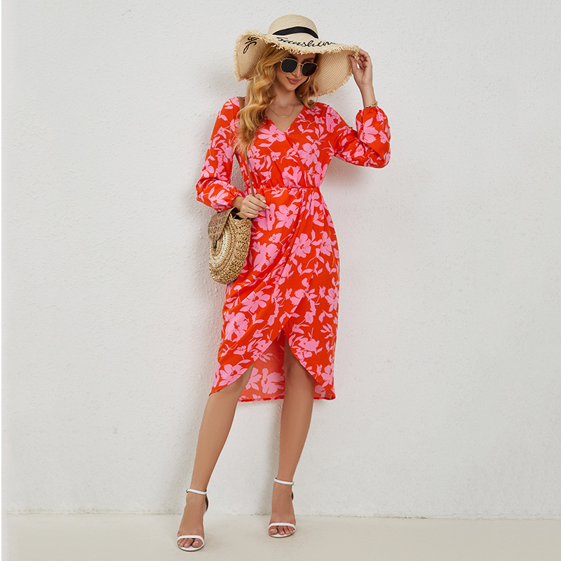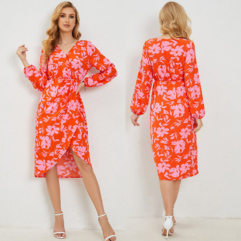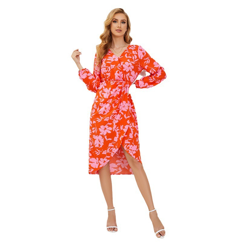 Cross-border foreign trade AliExpress Amazon independent station 2023 European and American autumn printed elastic waist chiffon dress women