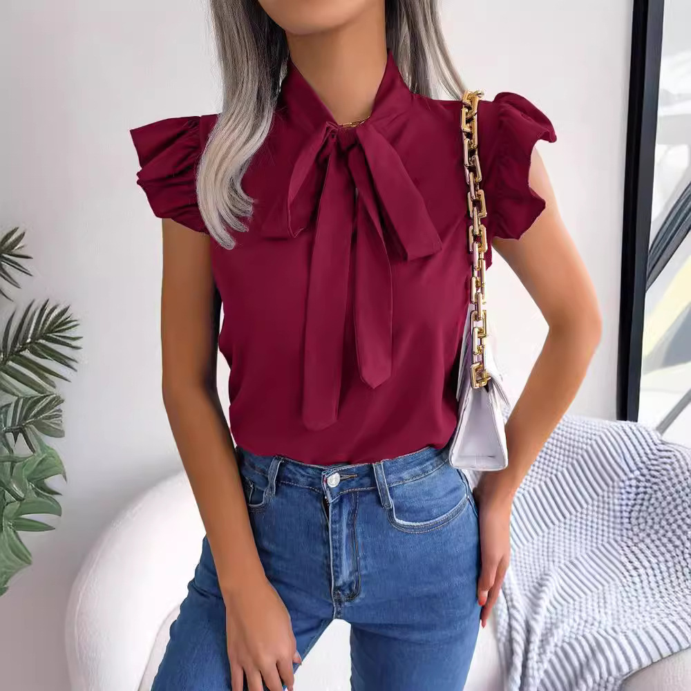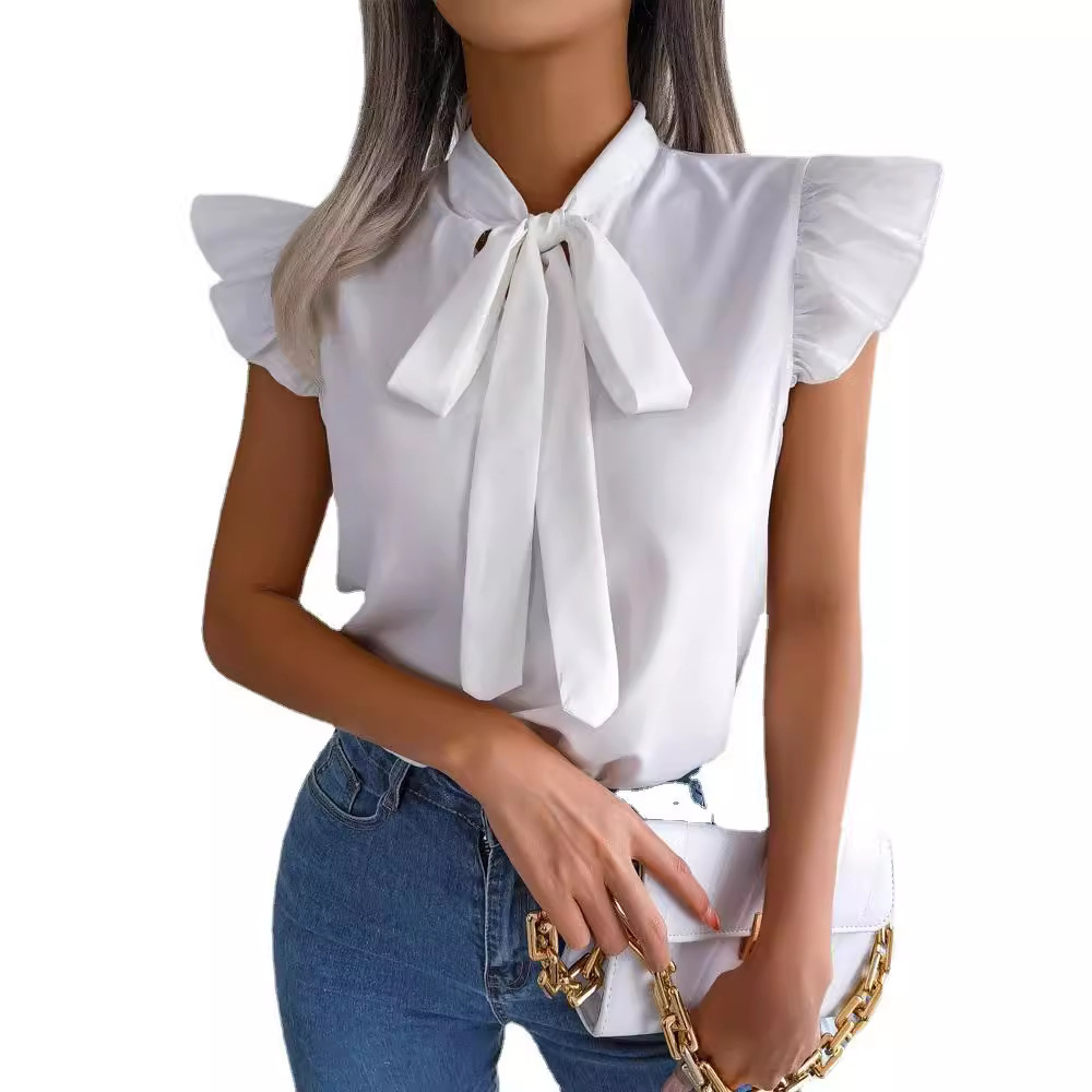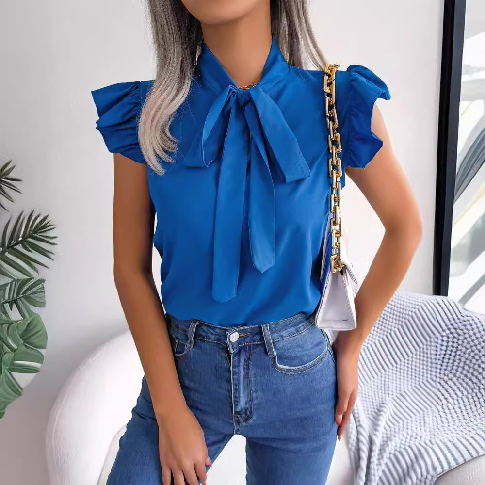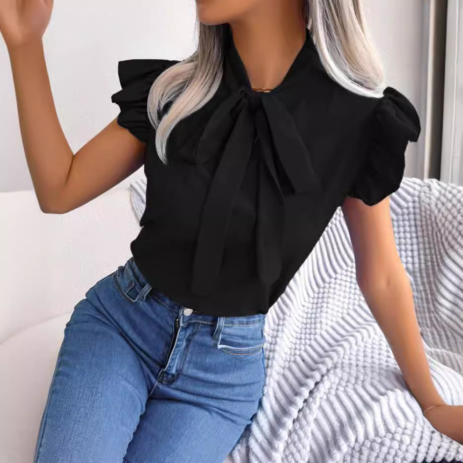 | nameOriginal | Cross-border foreign trade Amazon AliExpress 2023 Summer new solid color simple shirt bow short sleeve shirt Women |