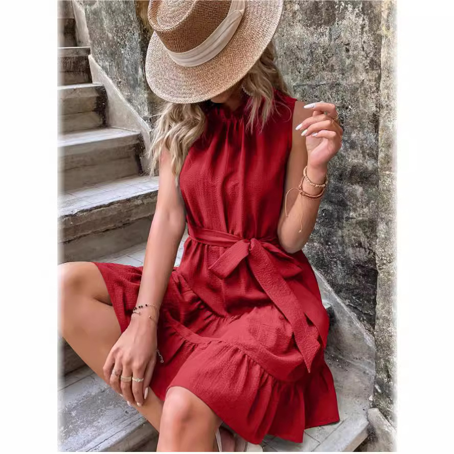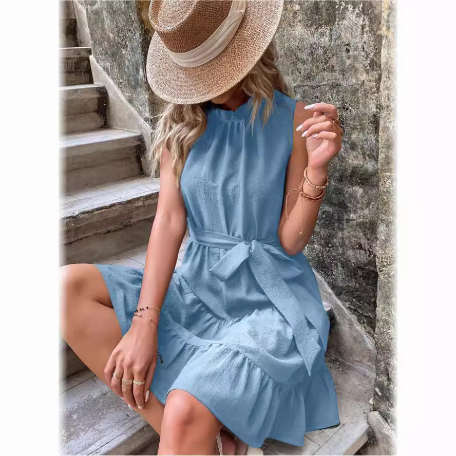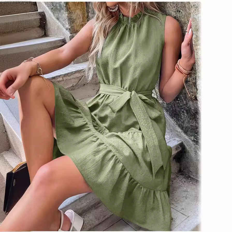 | nameOriginal | Cross-border Foreign Trade Amazon Independent Station 2023 Summer Solid Color Round Neck Sleeveless Lace Waist Ruffled Dress |