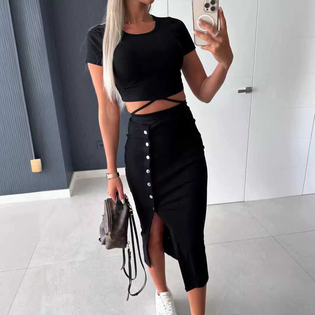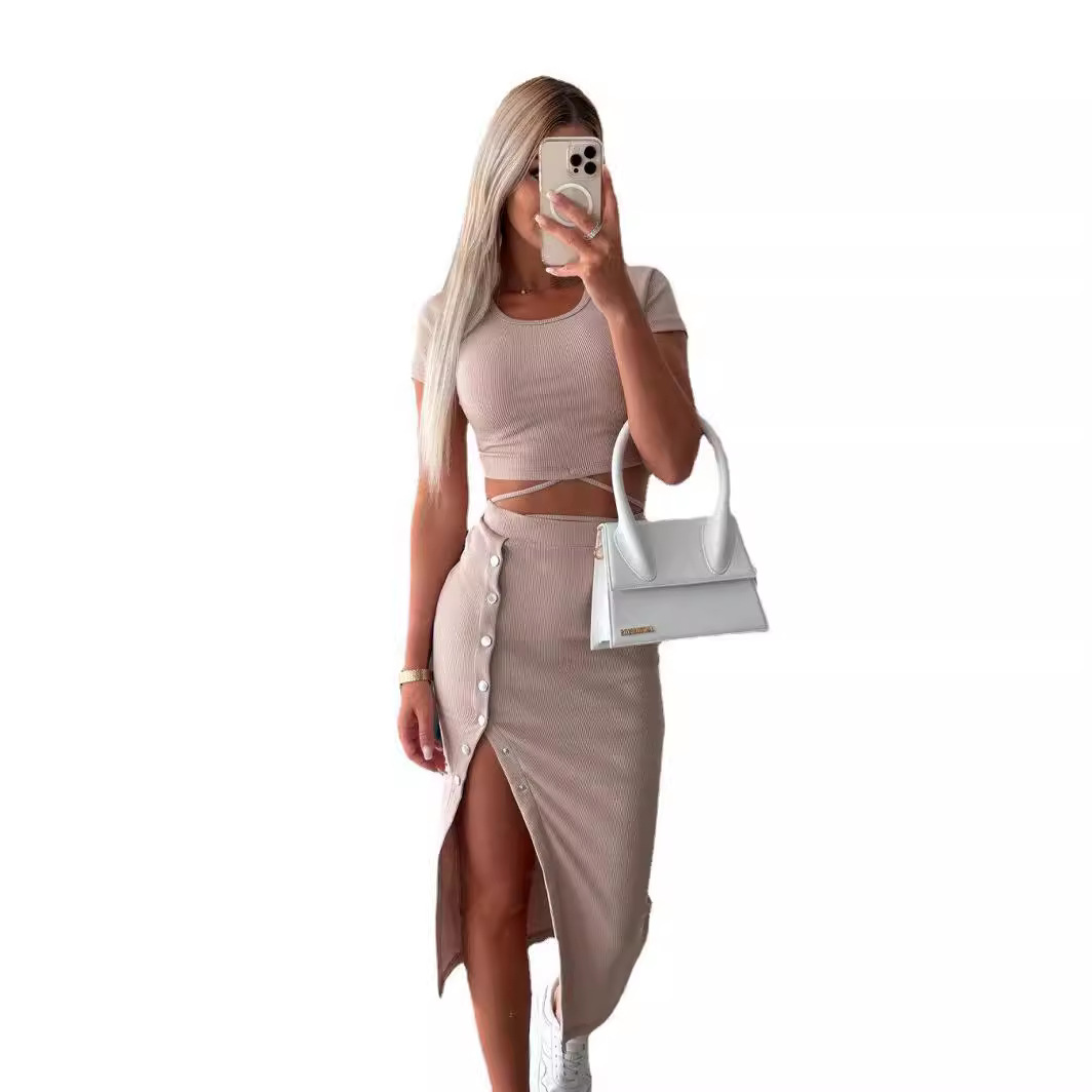 | nameOriginal | Cross-border foreign trade European and American women's clothing 2023 autumn and winter short sleeve round neck suit button navel hip skirt casual two-piece suit |