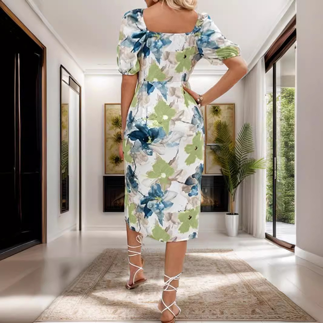 Cross-border foreign trade European and American women’s clothing 2024 summer AliExpress Amazon printed short sleeve bubble sleeve split dress