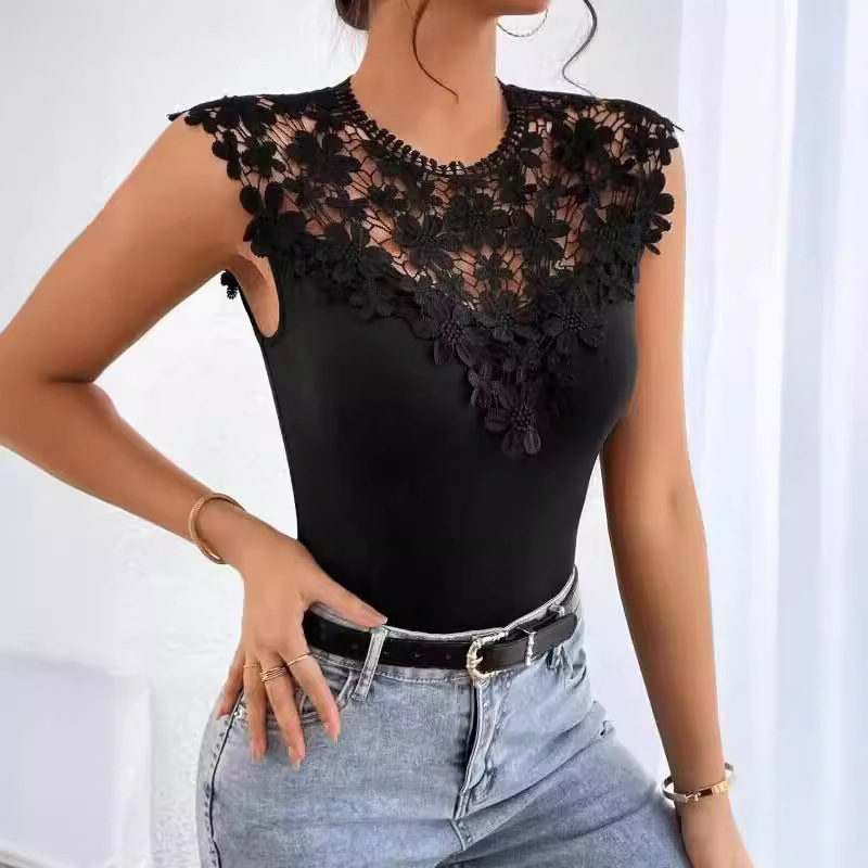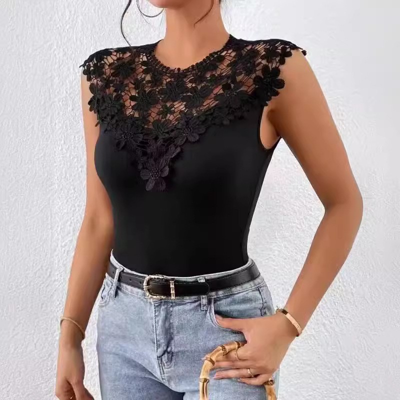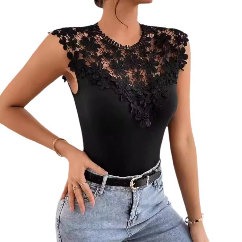 Cross-border foreign trade European and American women's clothing 2024 Summer new water soluble lace stitching sleeveless sexy top stretch T-shirt
