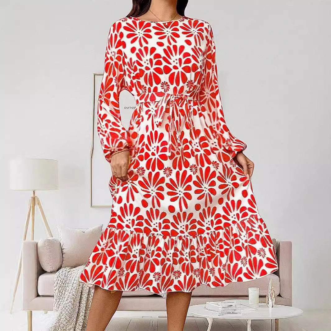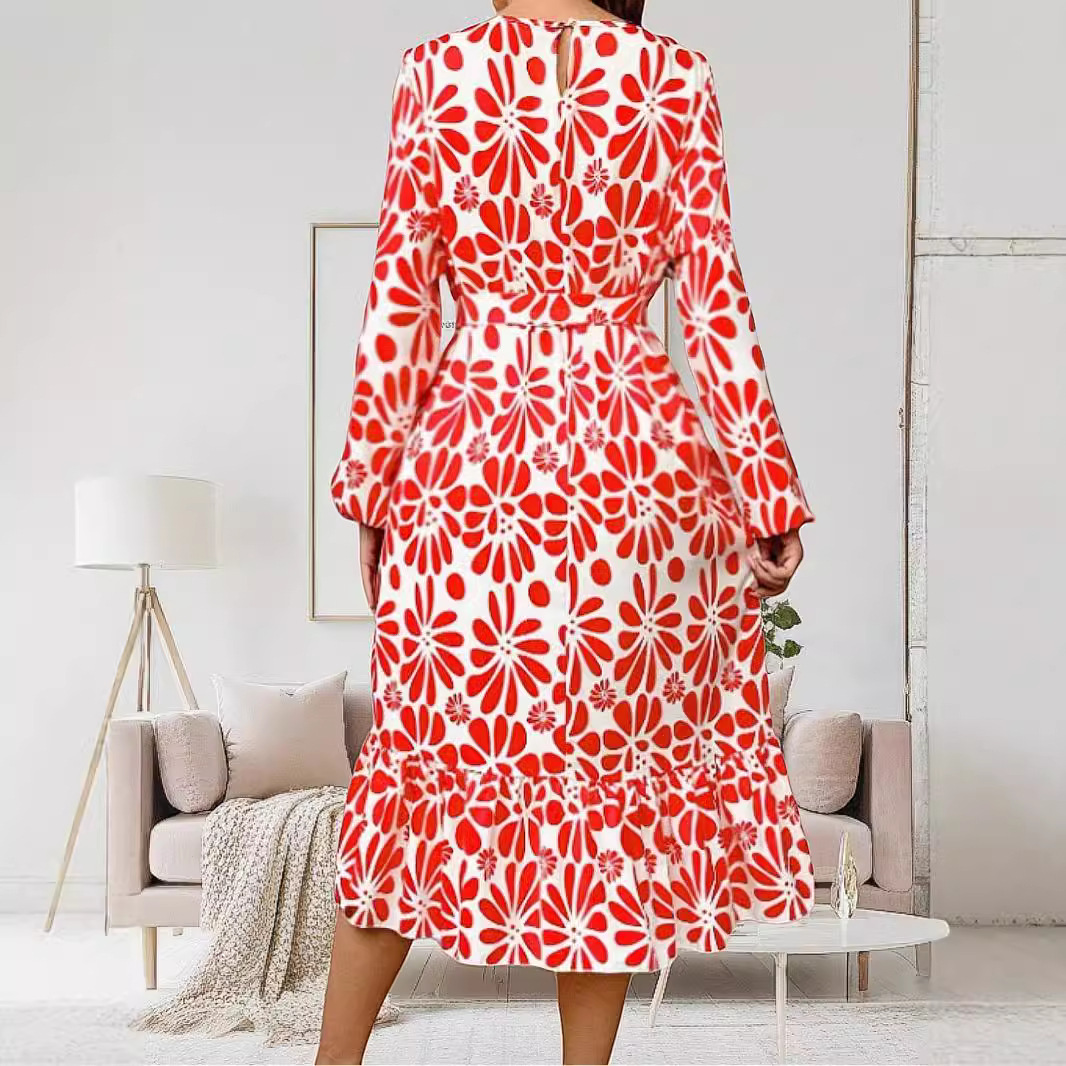 | nameOriginal | Cross-border foreign trade European and American women's clothing Amazon 2024 autumn and winter fashion V-neck printing lace-up waist long sleeve dress |