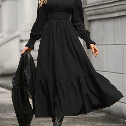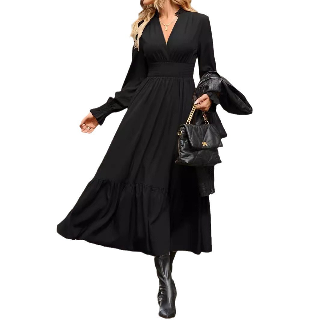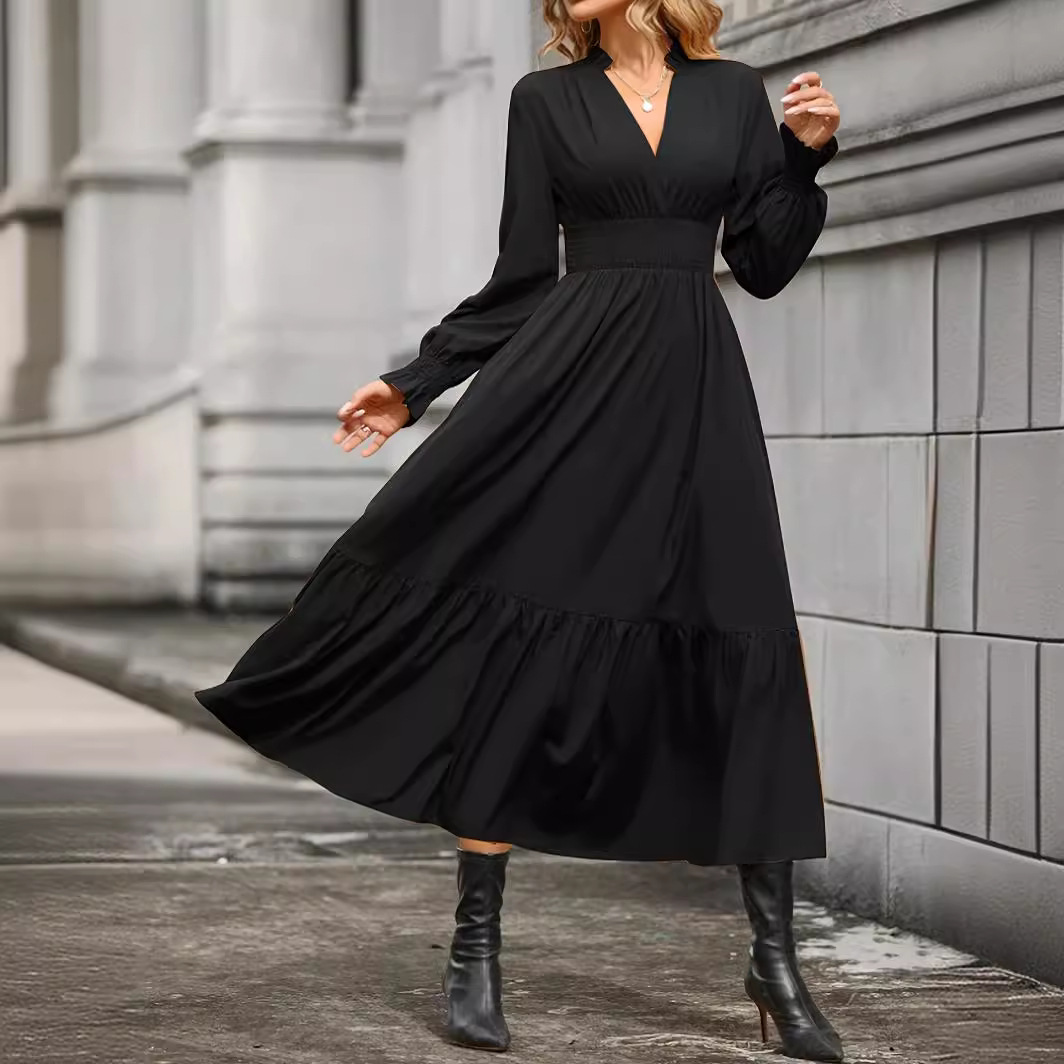| nameOriginal | Cross-border foreign trade European and American women's clothing Amazon 2024 spring and autumn fashion solid color lantern long sleeve V-neck large pendulum dress |
