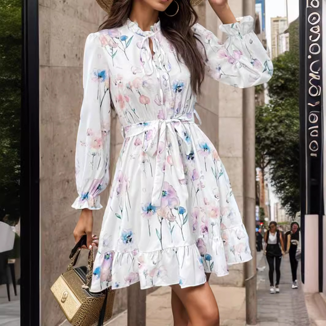 | nameOriginal | Cross-border foreign trade European and American women's clothing Amazon 2024 spring fashion floral print lace-up waist long sleeve dress |