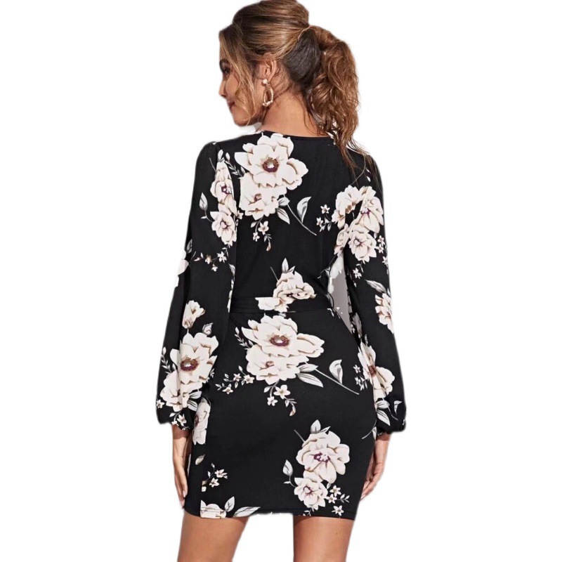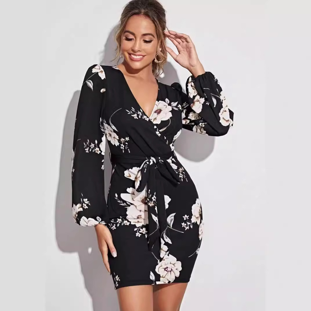 | nameOriginal | Cross-border foreign trade European and American women's clothing Amazon 2024 Summer V-neck printed lace-up waist slim-fit sheath dress |