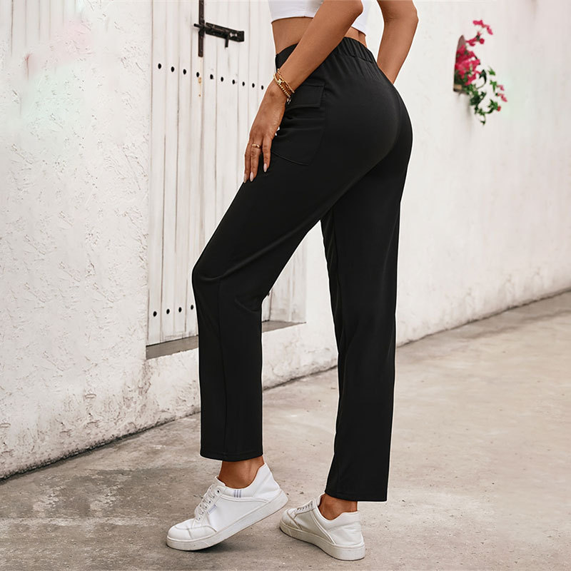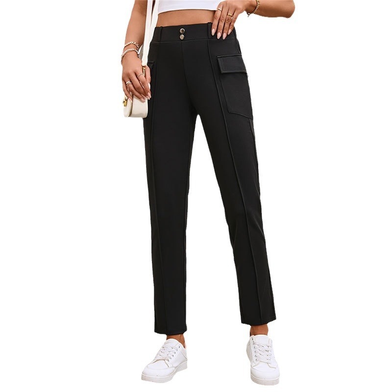 Cross-border Foreign Trade High Waist Knitted Button Workwear Pocket Straight Pants Commuter Slim-fit Casual Pants Women’s Pants Trousers