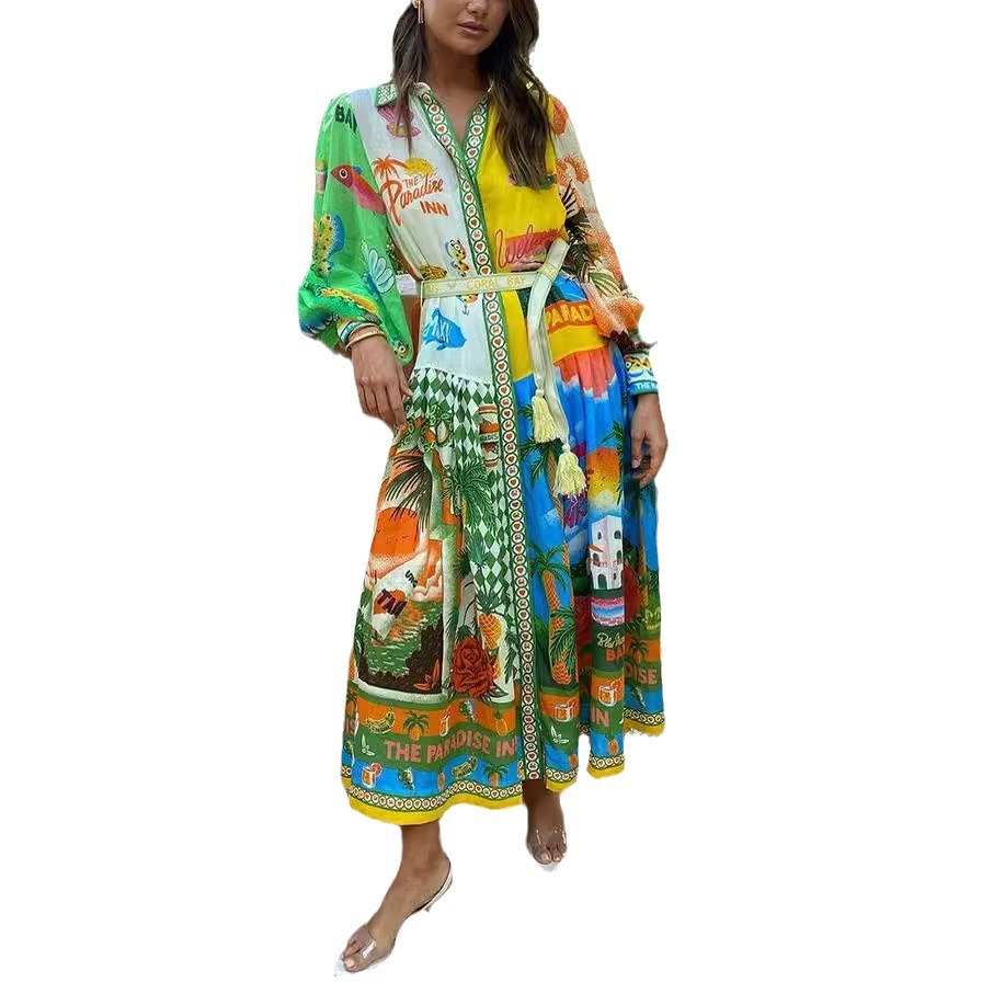 | nameOriginal | Cross-border foreign trade independent station Amazon 2024 New printed cardigan lace-up graffiti large swing long sleeve dress women |