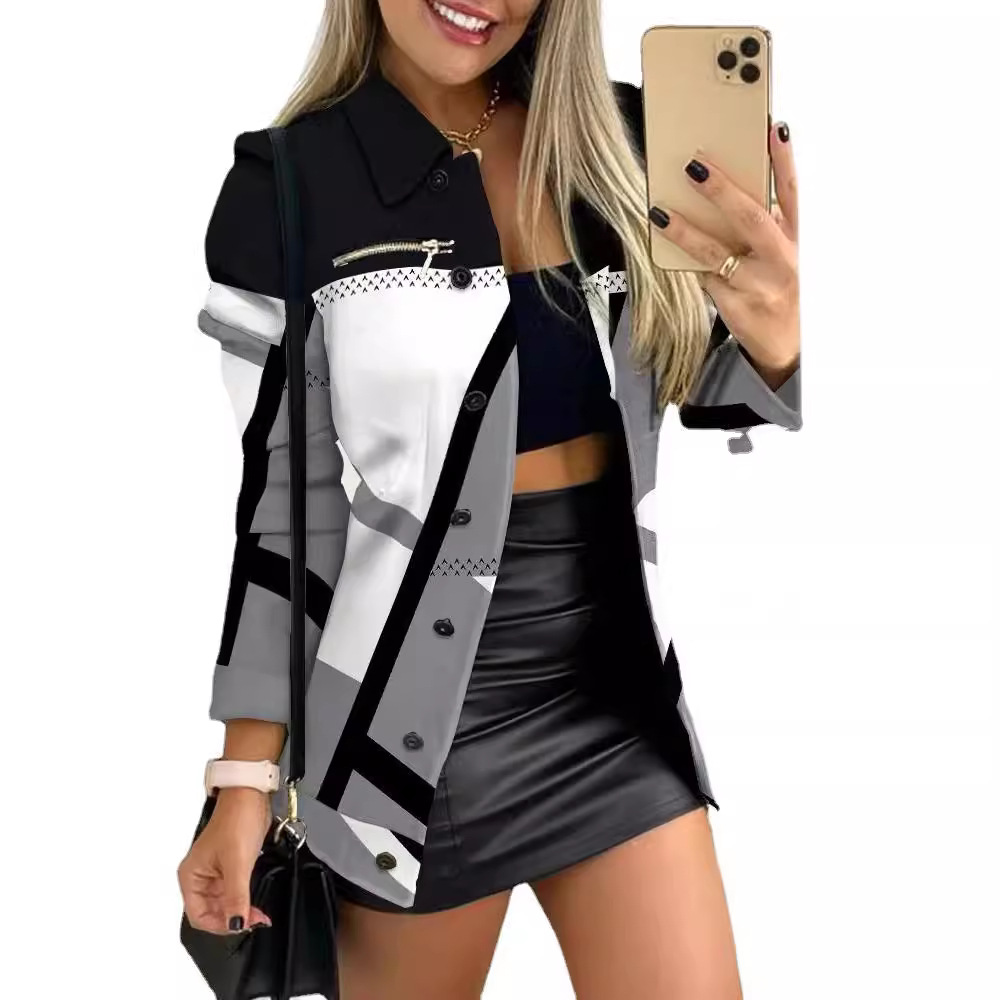 | nameOriginal | Cross-border foreign trade independent station wish Amazon 2023 autumn and winter long sleeve zipper color matching printed lapel casual coat |