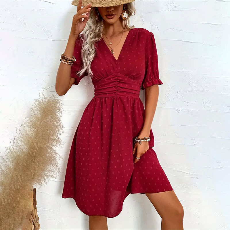 | nameOriginal | Cross-border Foreign Trade Jacquard High Waist Short Dress Summer Women's High-end Solid Color Short Sleeve V-neck A- line Skirt |