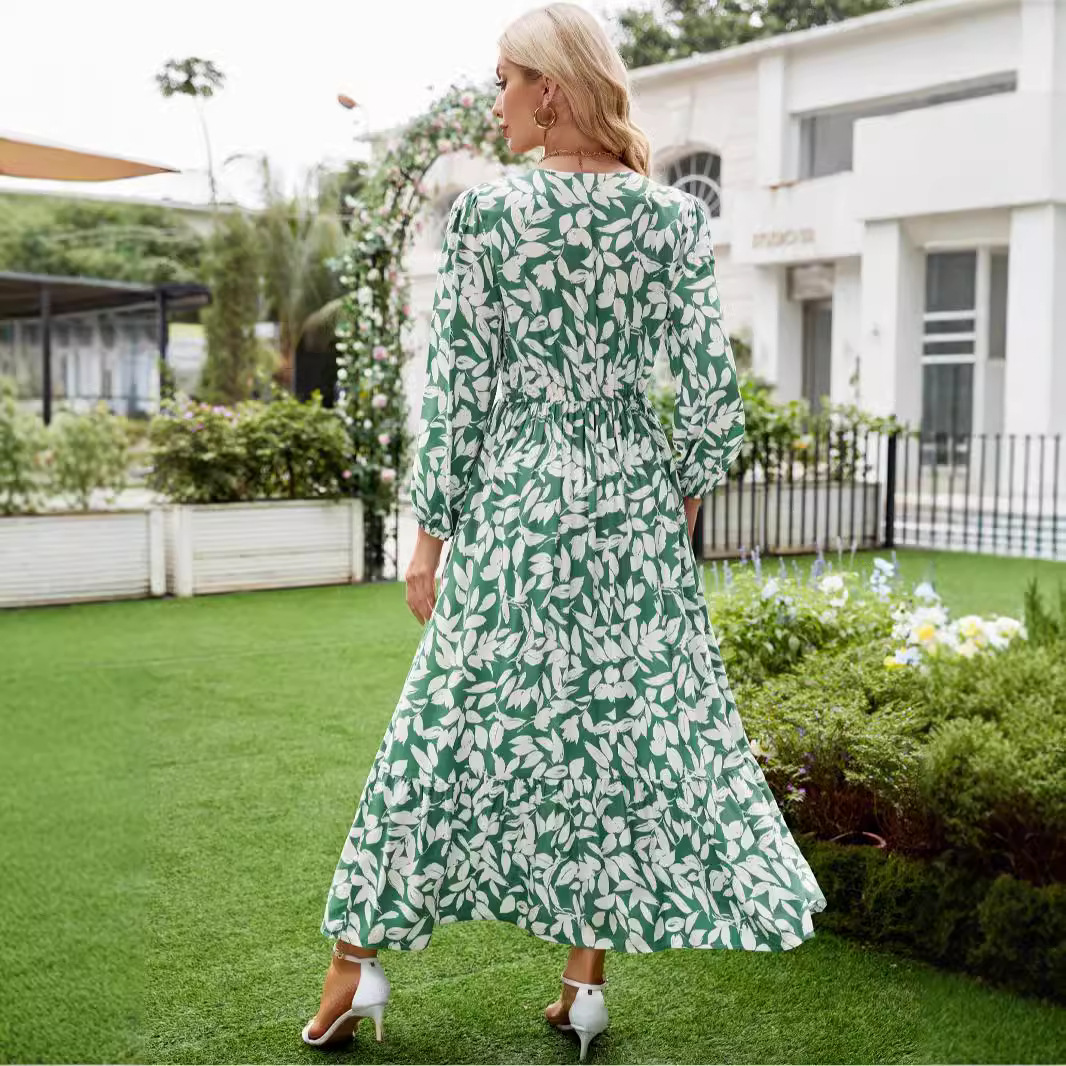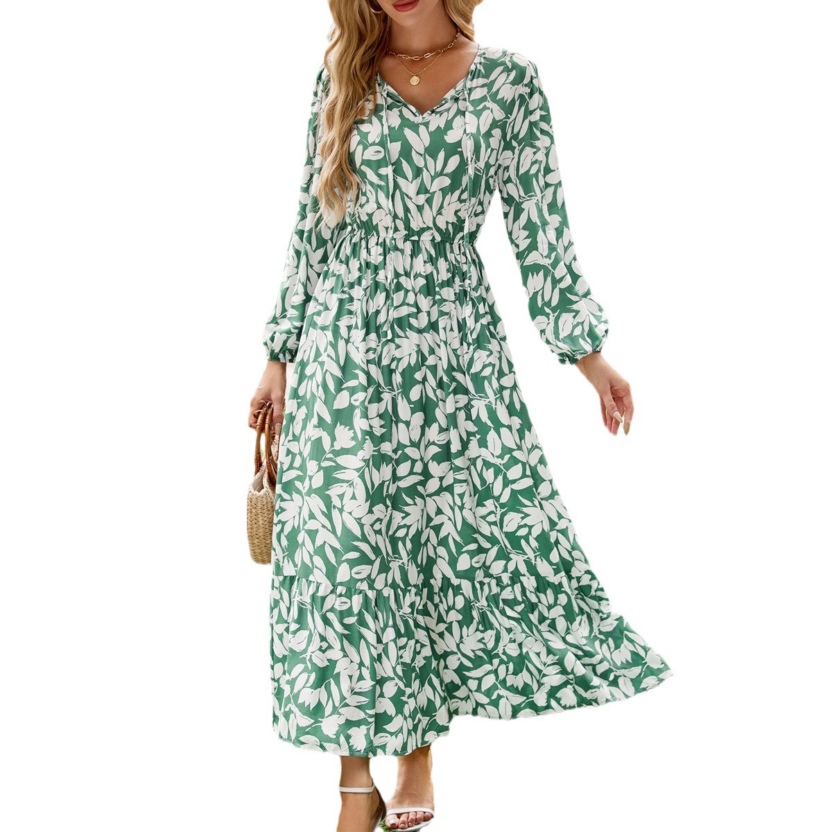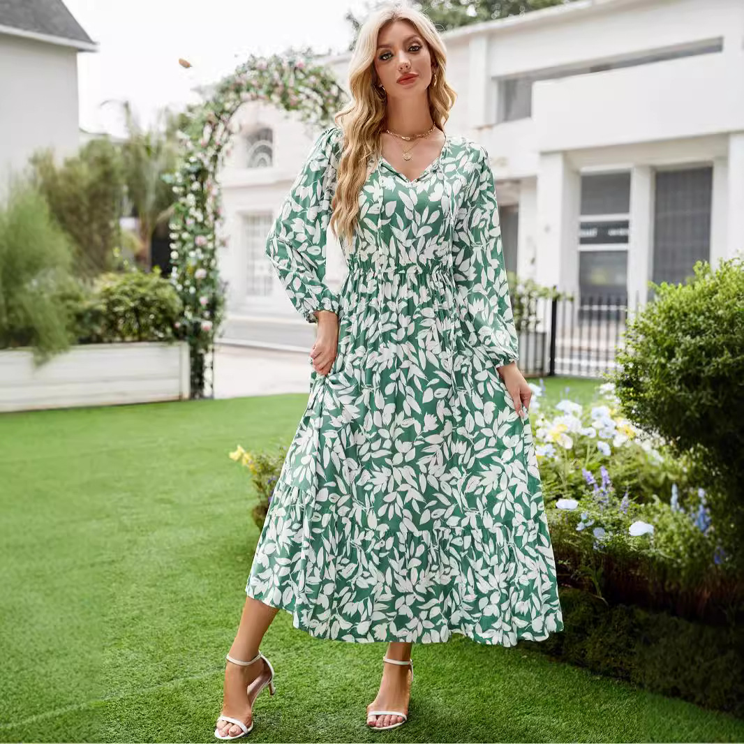 | nameOriginal | Cross-border Foreign Trade Women's Wear Collar Bow Loose Lantern Sleeve Vacation Dress Printed Mid-length Slim Large dress |