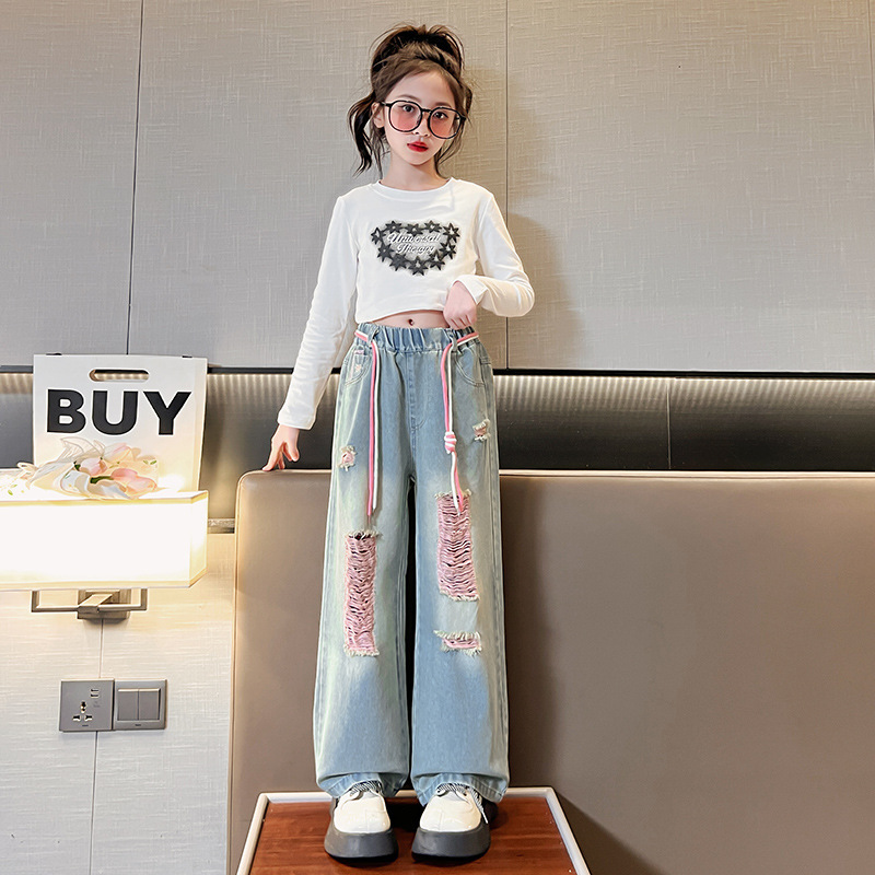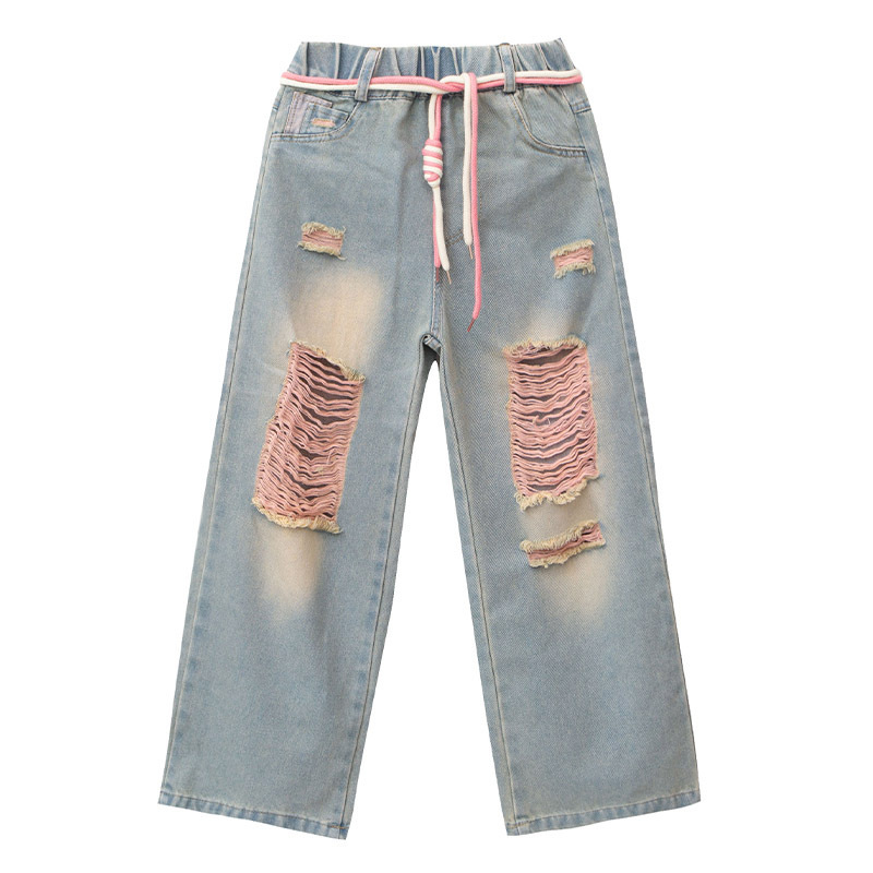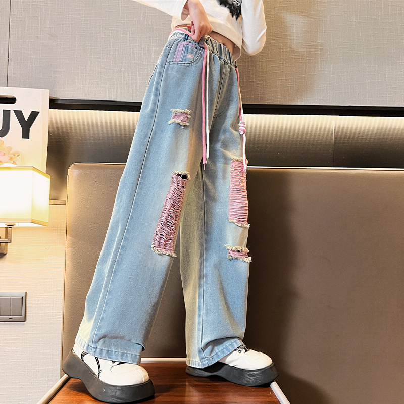 | nameOriginal | Cross-border girls' straight jeans 2023 new Korean style medium and big children's casual ripped wide-leg pants fashionable one-piece delivery |