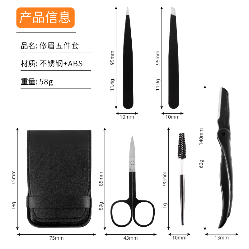 | nameOriginal | Cross-border in stock black eyebrow trimming 5-piece eyebrow trimming scissors eyebrow pulling clip eyelash brush eyebrow shaving knife tool suit |