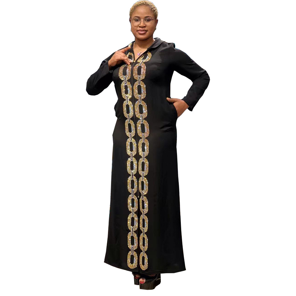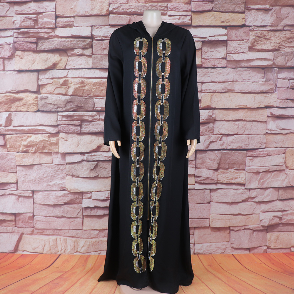 | nameOriginal | Cross-border independent station African Muslim style women's black robe rhinestone zipper hooded long sleeve original picture supply |