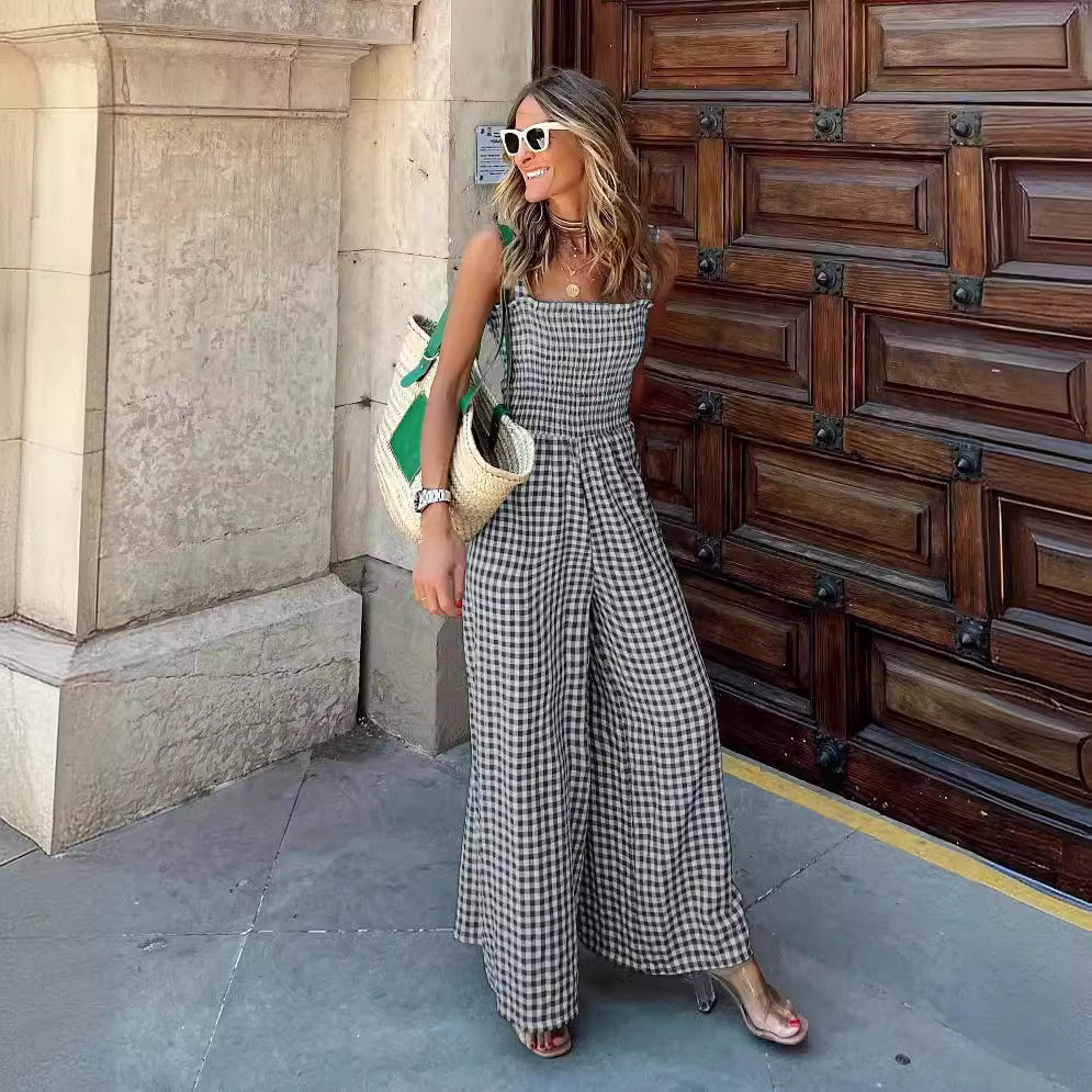 | nameOriginal | Cross-border independent station Amazon 2022 summer temperament women's trousers plaid jumpsuit waist casual pants |