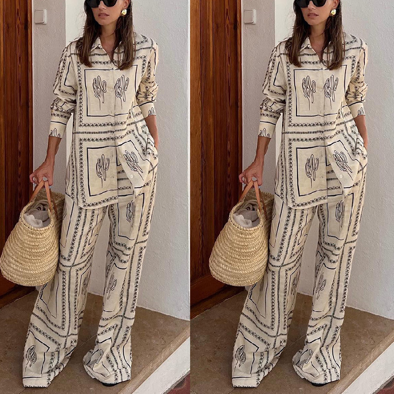 | nameOriginal | Cross-border independent station Amazon 2023 new European and American printed long-sleeved shirt + trousers two-piece suit home wear |