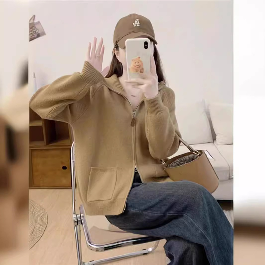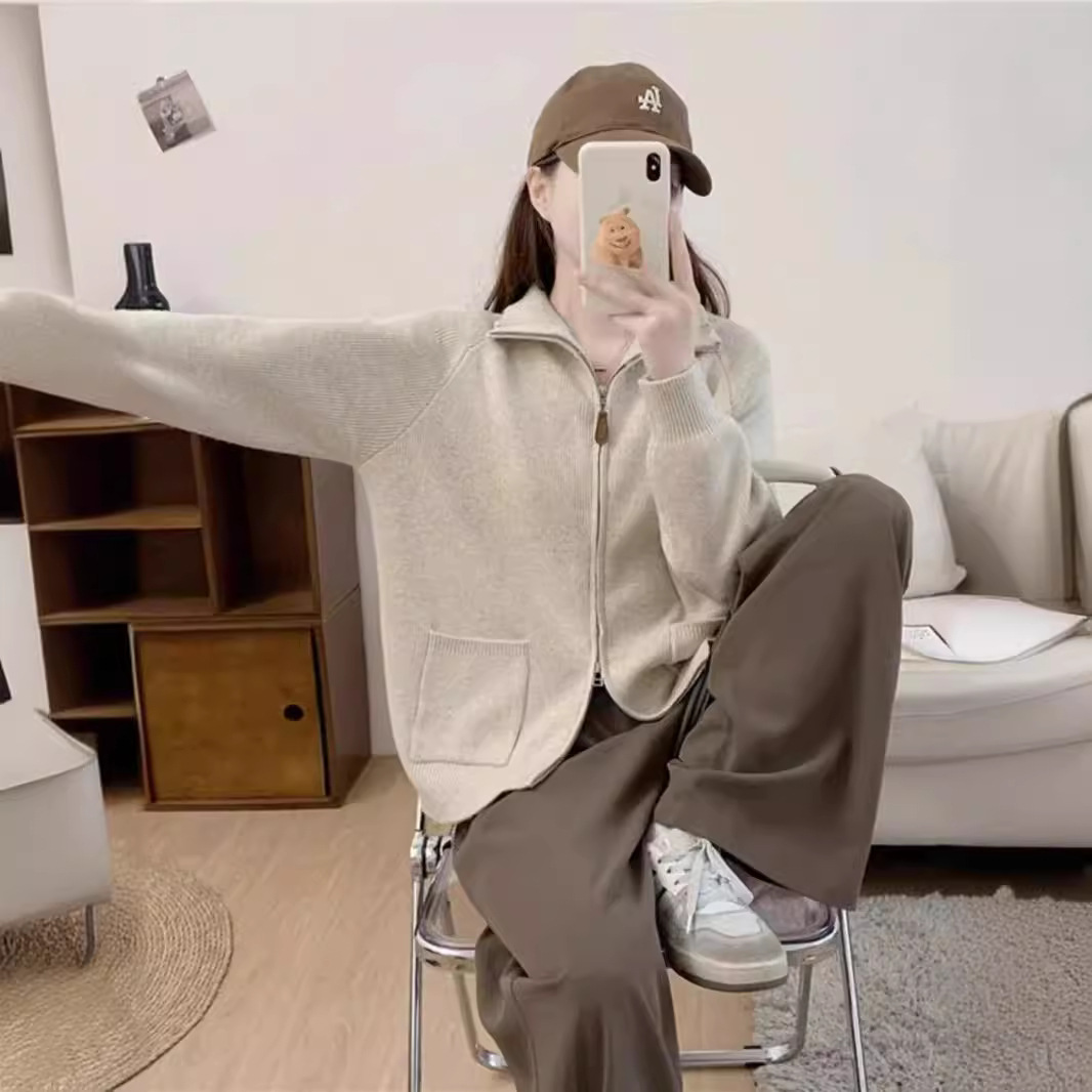 | nameOriginal | Cross-border New Double Zipper Design Sense Stand Collar Pocket Knitted Top Women's Simple Loose Basic Sweater Cardigan |