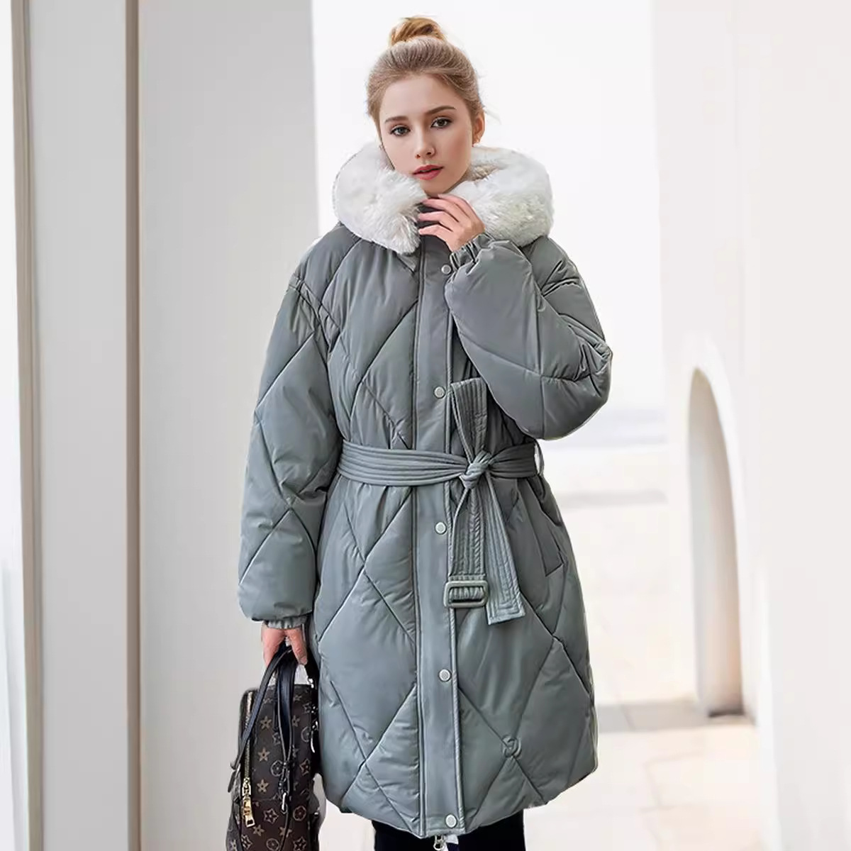 | nameOriginal | Cross-border plus size fleece-lined Lambskin Large Fur Collar Tight Waist Diamond Plaid Slimming Down Cotton-padded Jacket Women's Mid-length Cotton Jacket |