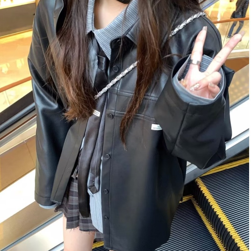 | nameOriginal | Cross-border Retro Hong Kong-style Black Leather Jacket Women's Spring 2023 New Sweet Cool Loose Mid-length Jacket Motorcycle |