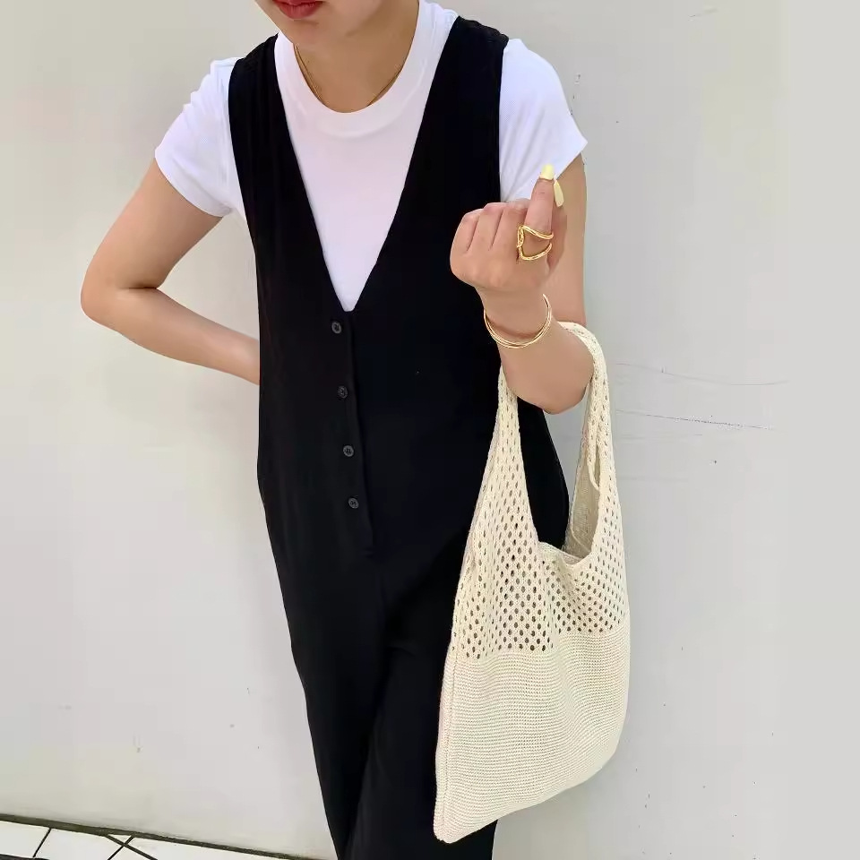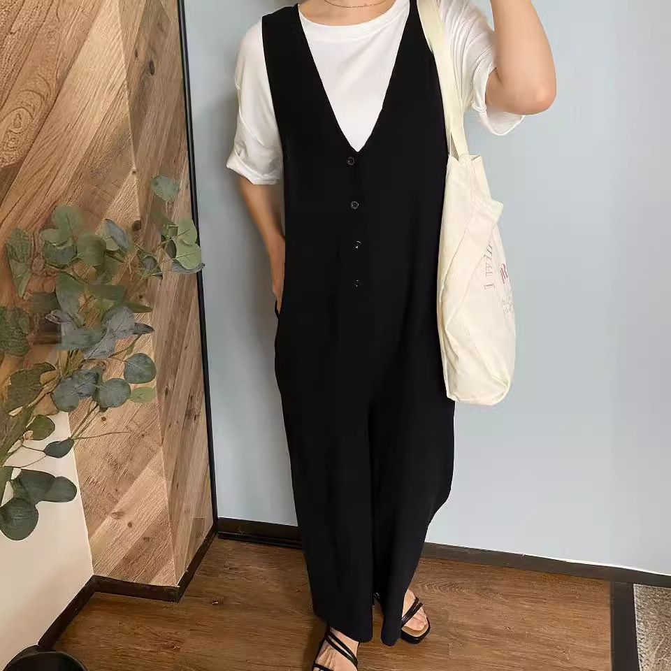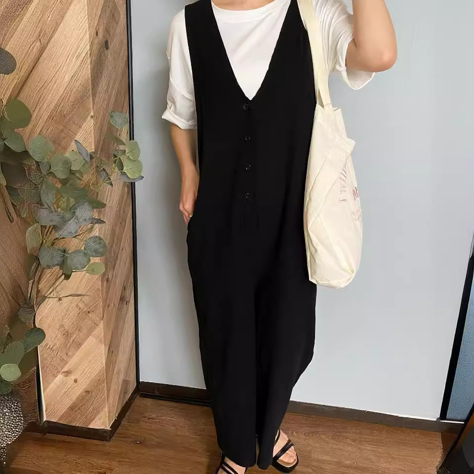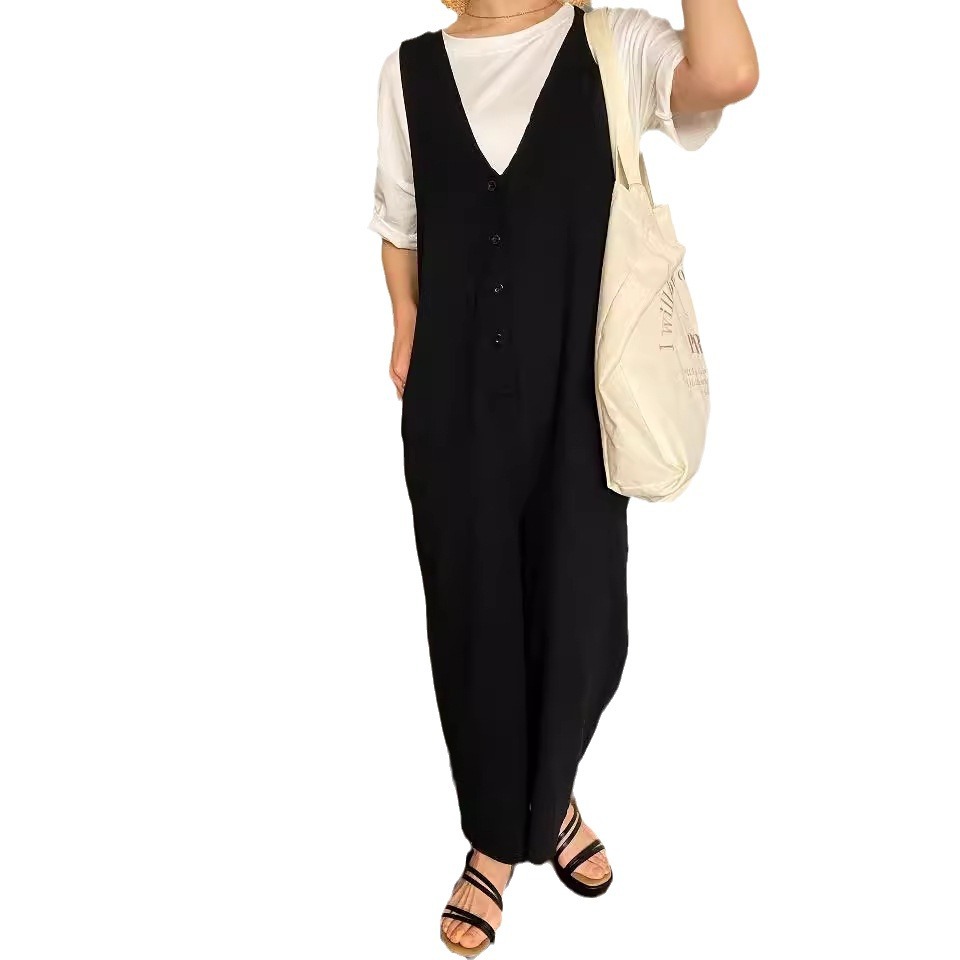 Cross-border Source 2024 Summer New Lotte Loose Slim Japanese V-neck Overalls Sleeveless Pocket Jumpsuit