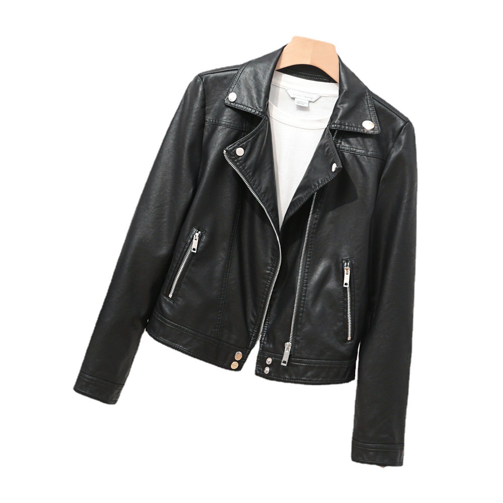 Cross-border Spring New Women’s Simple Lapel Leather Jacket Short Biker Clothing PU Leather Casual Coat Sequins