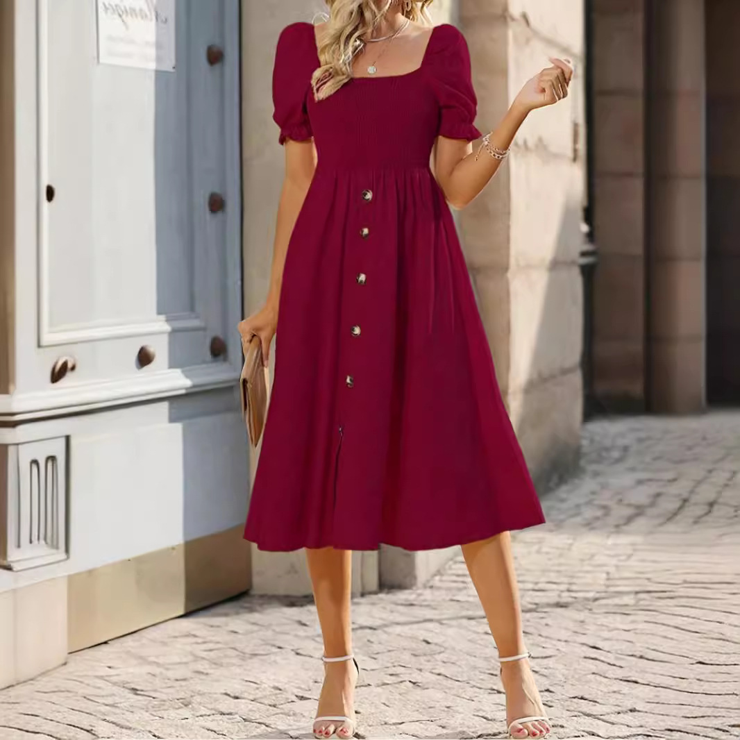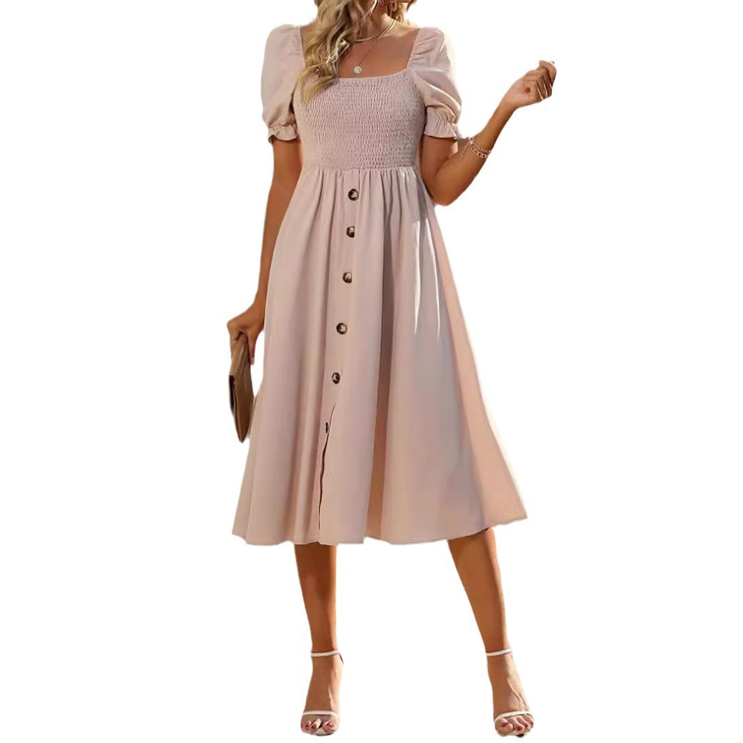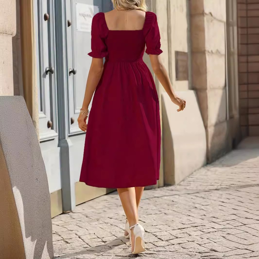 Cross-border Trade European and American Women's Clothing Amazon 2024 Summer Solid Color Square Neck Short-sleeved Single-breasted Ruffled dress