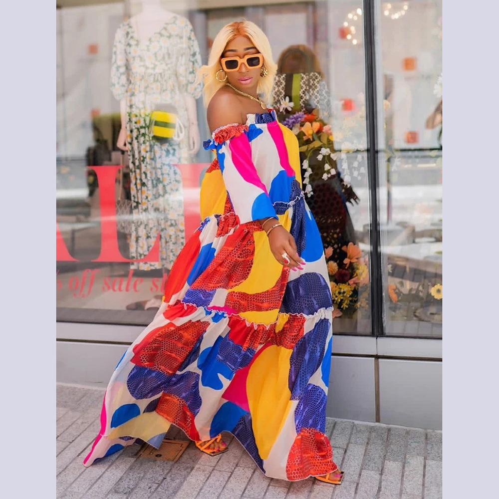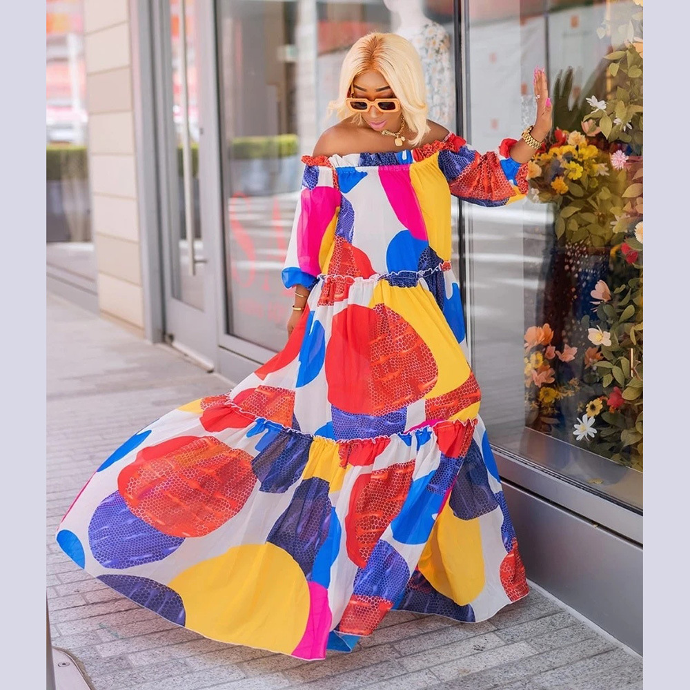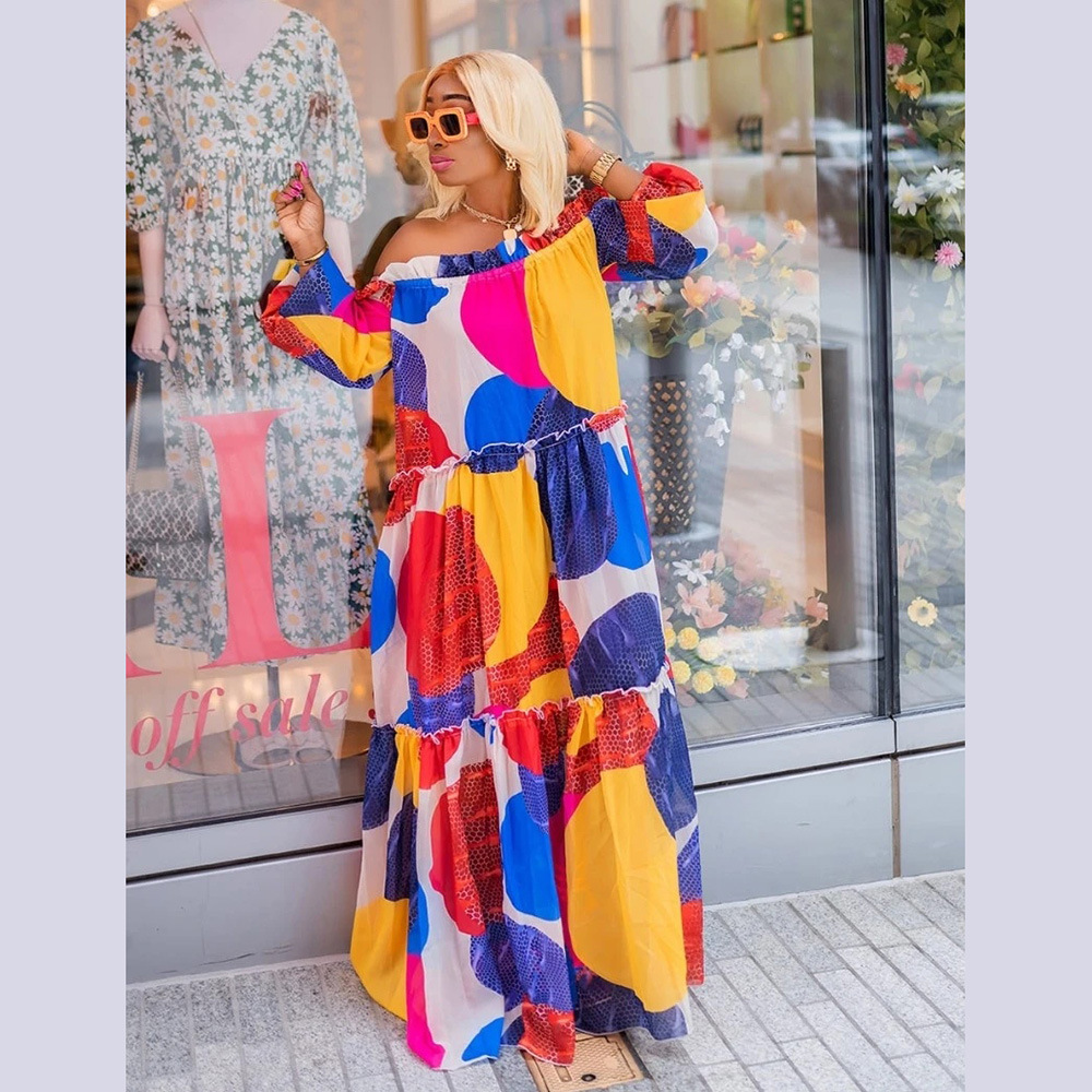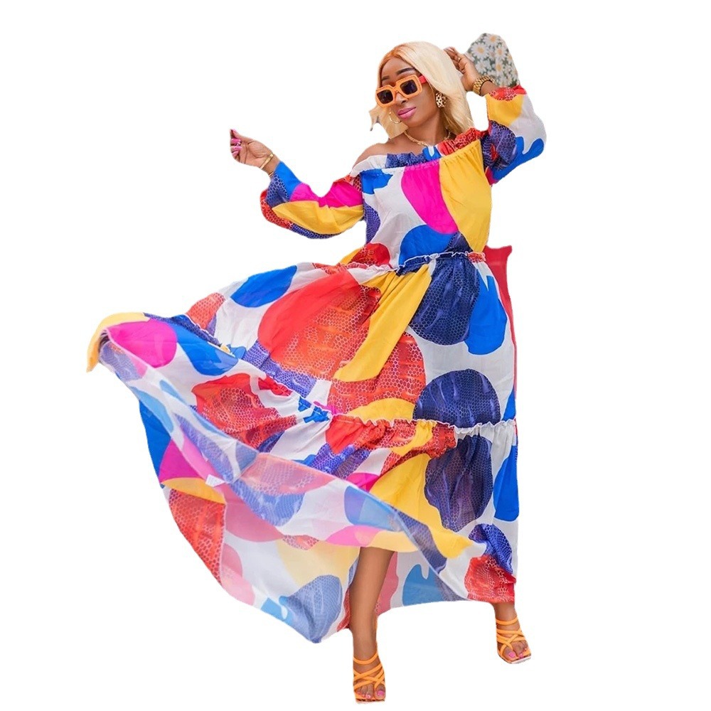 | nameOriginal | Cross-border Women's Clothing European, American and African Ethnic Style Large Pendulum Dress One-character Collar Four-sided Digital Printing + Belt |