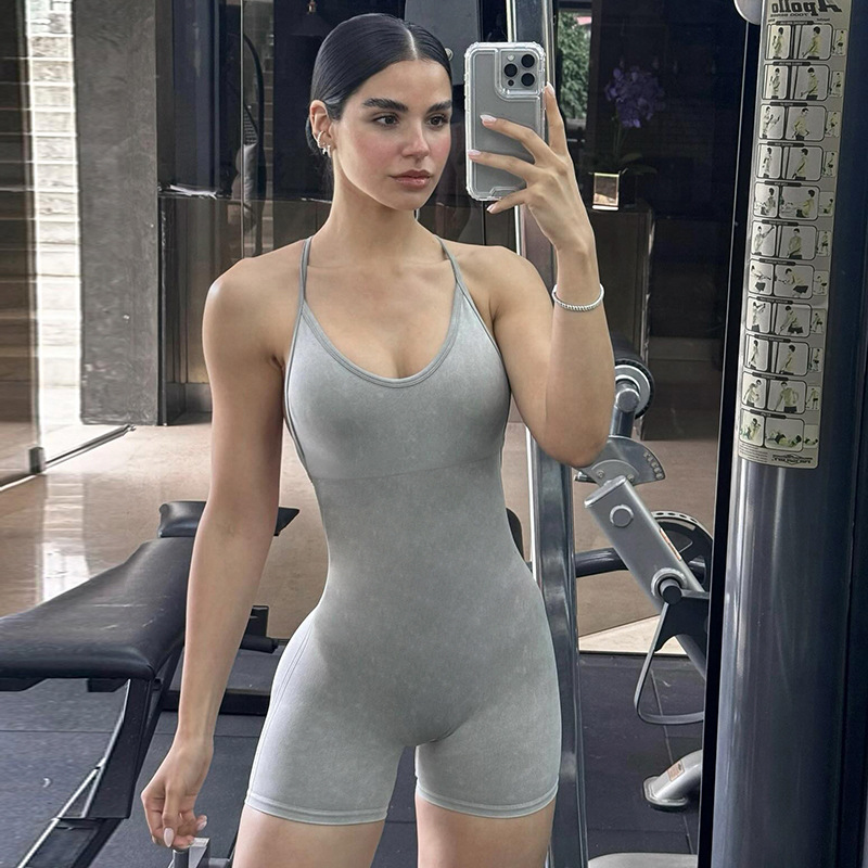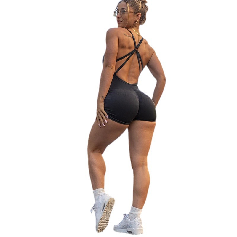 | nameOriginal | Cross-border Women's Cross Backless Round Neck Solid Color Tight Slimming Features Sexy Sports Casual Jumpsuit Shorts Women |