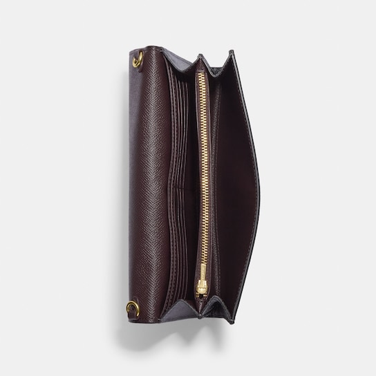 This product is made of durable crossgrain leather and features eight slots for credit cards, a full-length compartment for bills, and multiple pockets for additional storage. It also includes an outside open pocket and a detachable chain strap that can be worn over the shoulder or across the body. The dimensions of the product are 8 1/4″ in length, 5 1/4″ in height, and 1 1/4″ in width, and it is identified by the style number CH518.