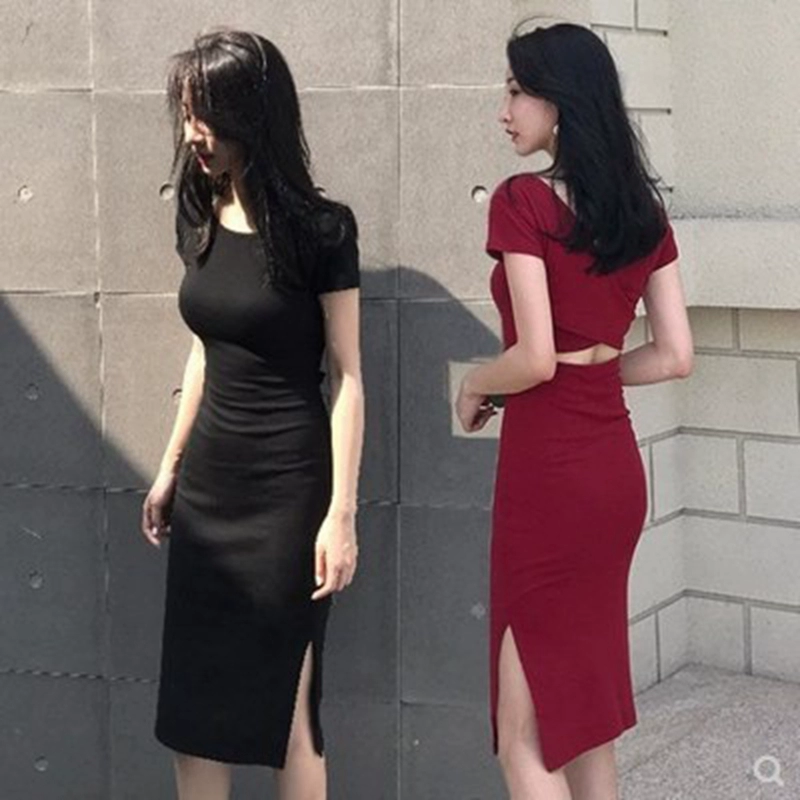 | nameOriginal | Crossover sexy short-sleeved round neck backless slit hip skirt |