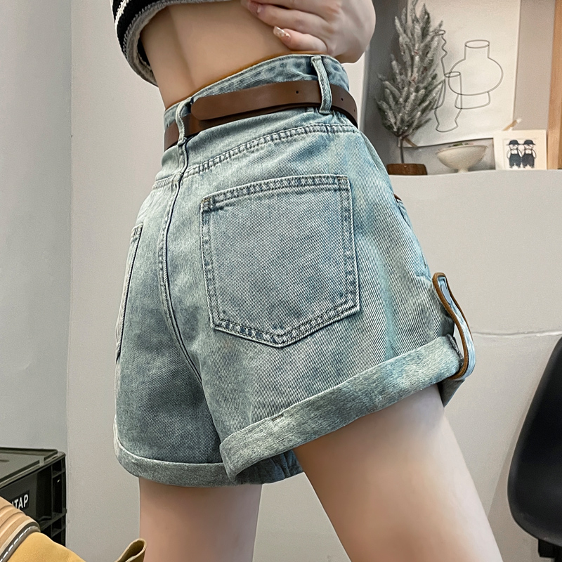 Curled Denim Shorts Women's Summer Thin 2024 Slimming High Waist Flower Bud Women's A- shape Tooling Hot Pants Trendy
