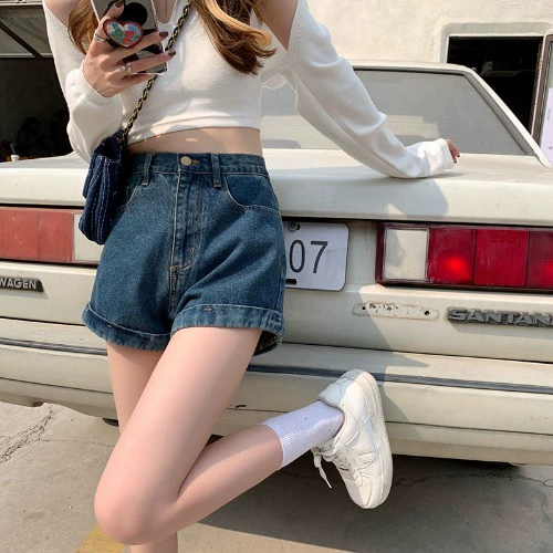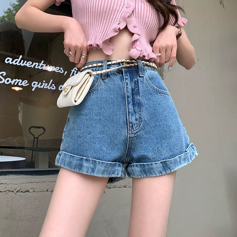 Curled women’s summer high waisted loose slimming denim shorts