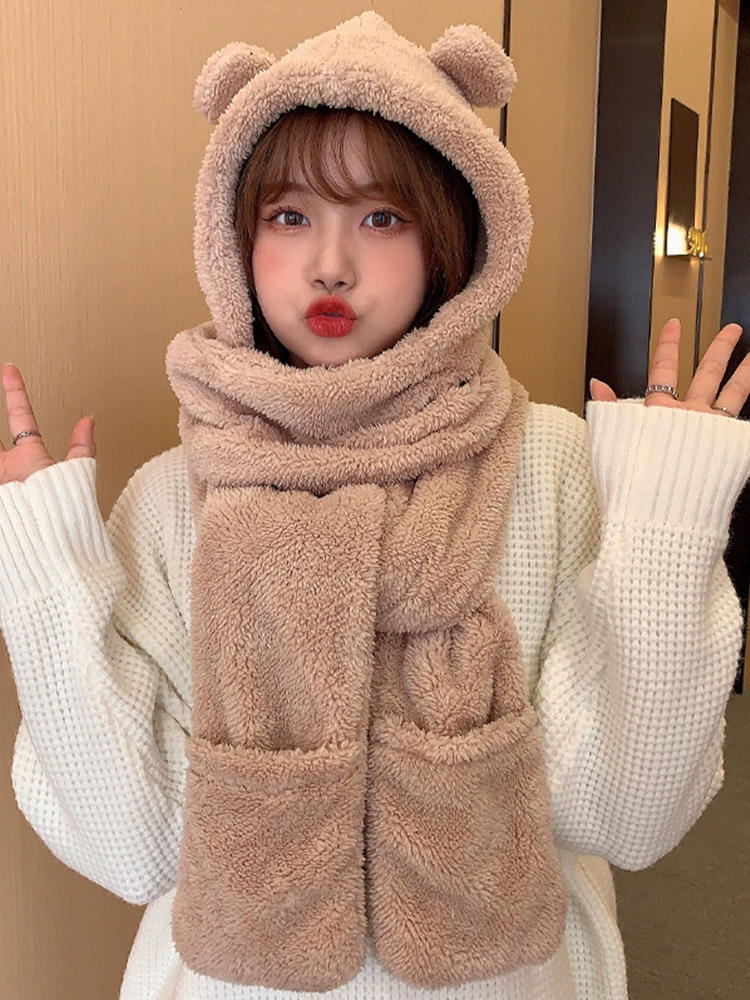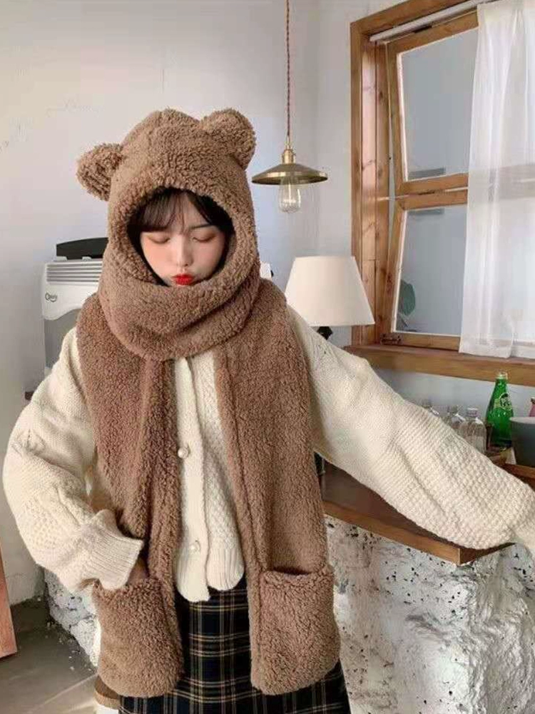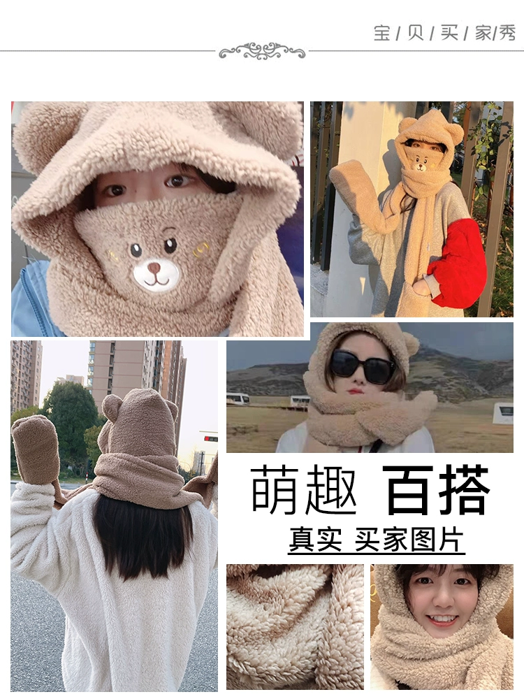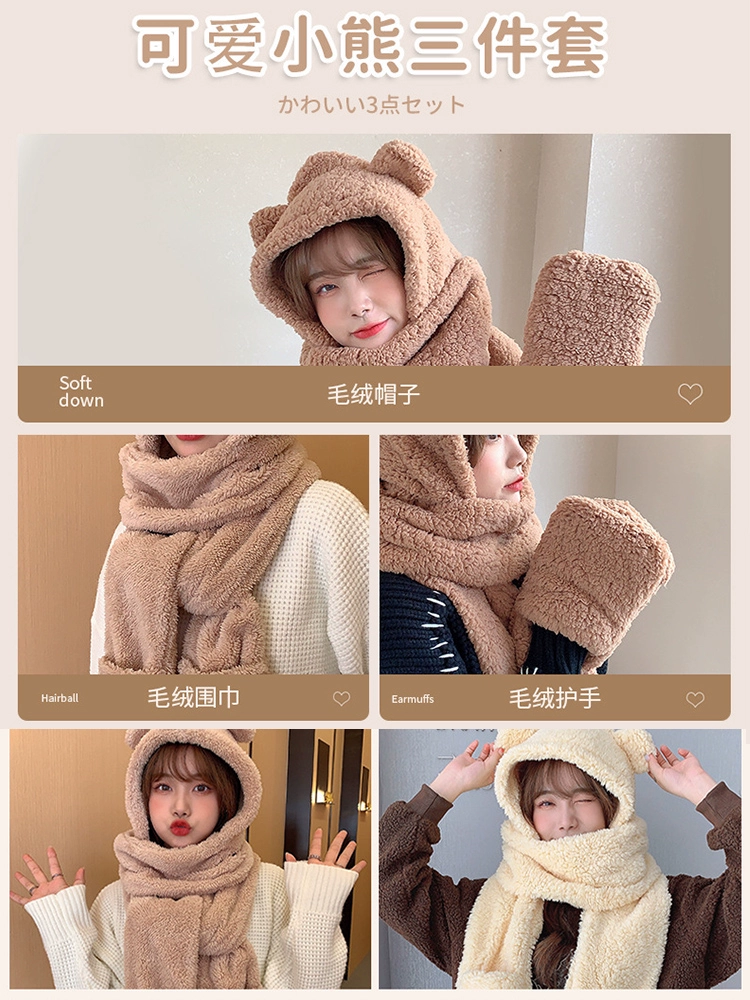 | nameOriginal | Cute bear ears hat, scarf and gloves all-in-one women's winter plush thick scarf winter warm three-piece set |