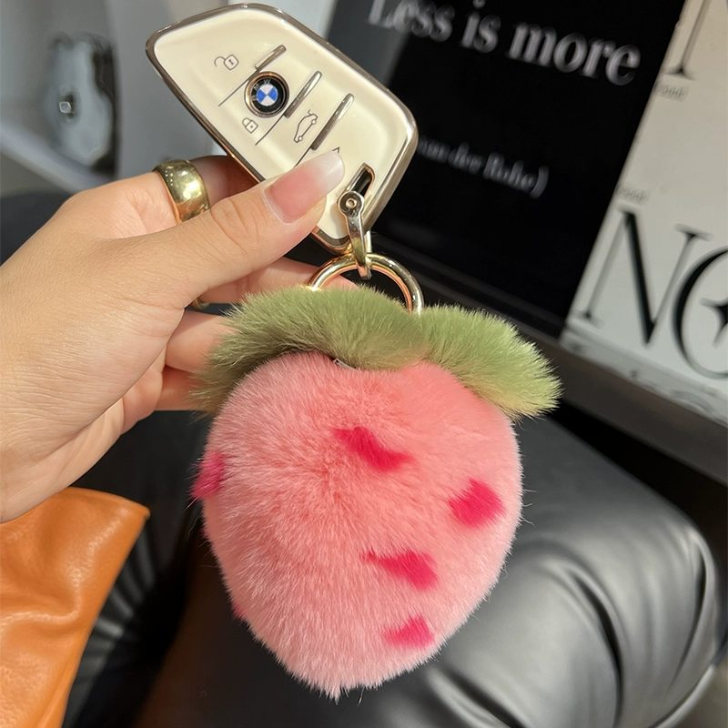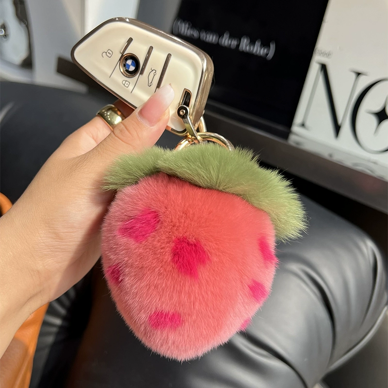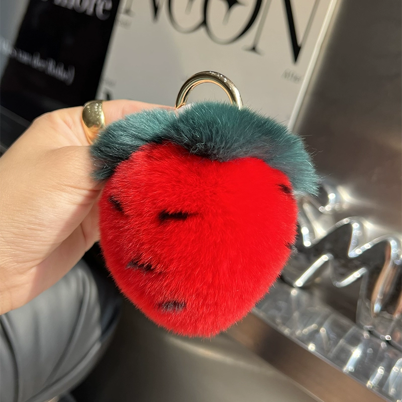 Cute little strawberry keychain pendant with real rex rabbit fur