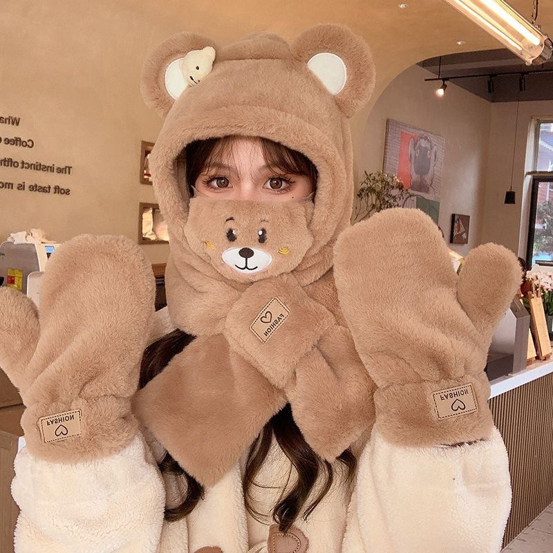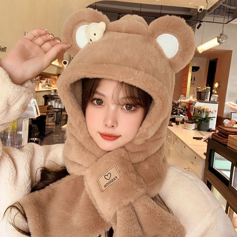 | nameOriginal | Cute plush hat scarf integrated women's autumn and winter riding windproof warm ear protection thickened cold-proof warm scarf |