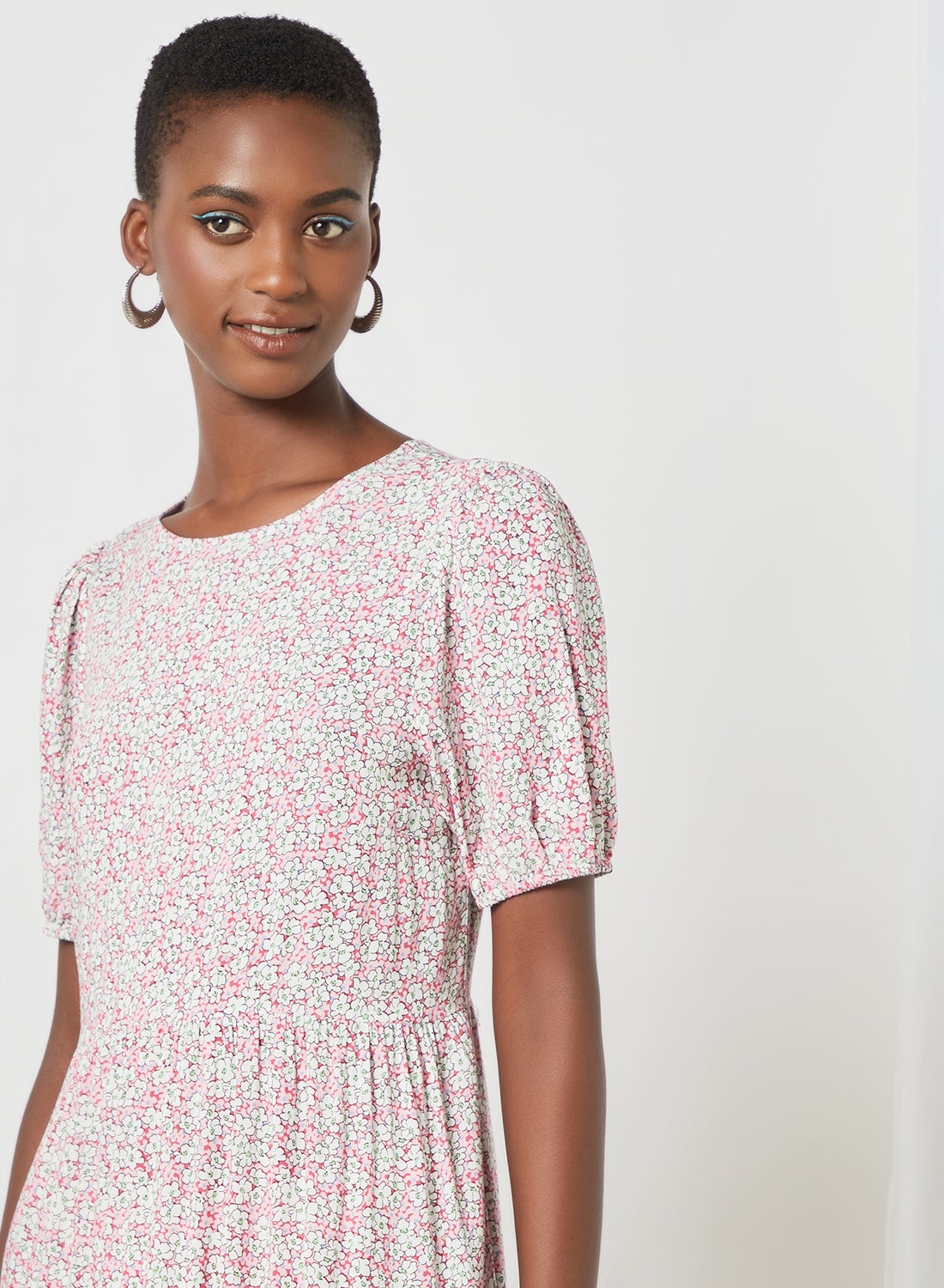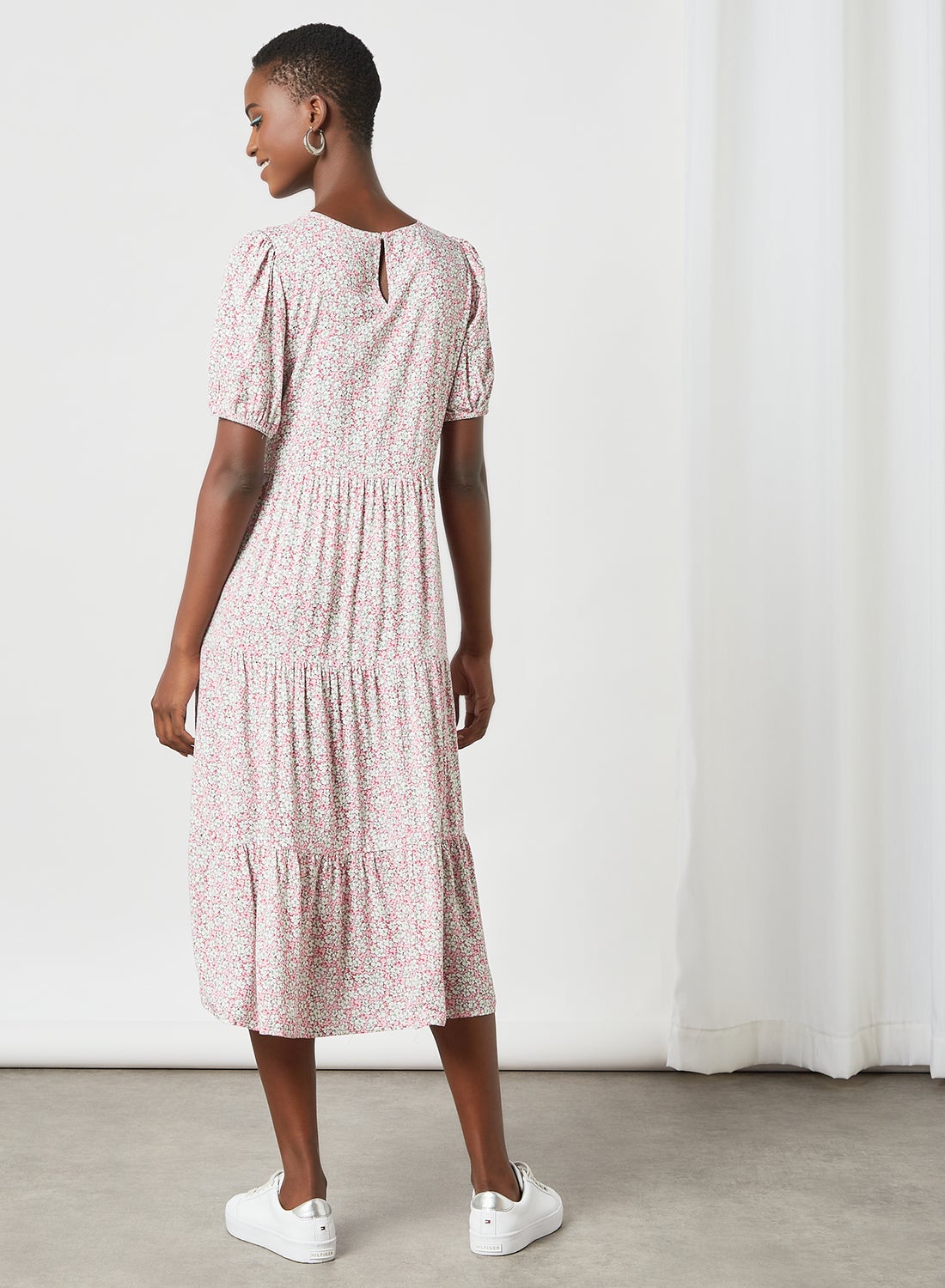 Cyciamen/White Flow Midi Dress with Tiered Floral Print.