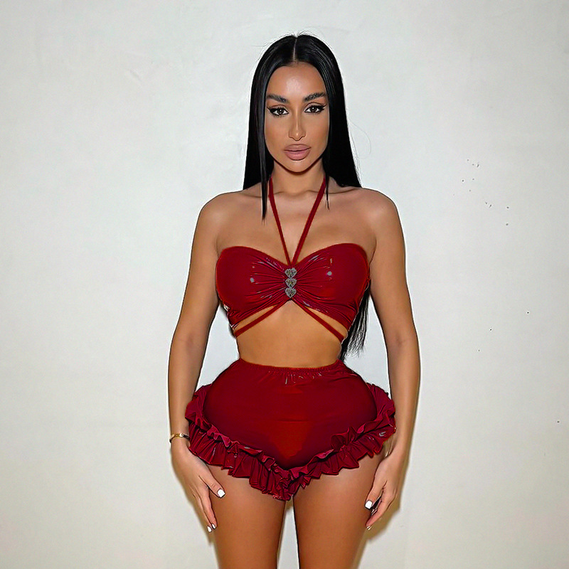 D23ST477 Amazon AliExpress 2024 New Sexy Love hanging neck wrapped chest PU leather high waist shorts suit