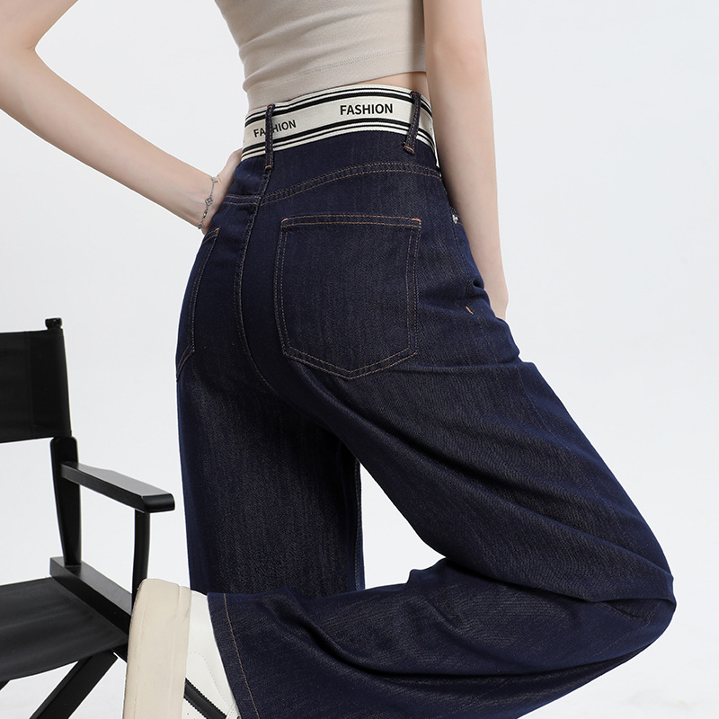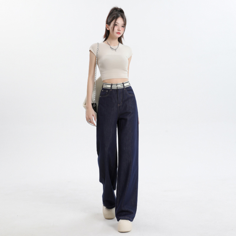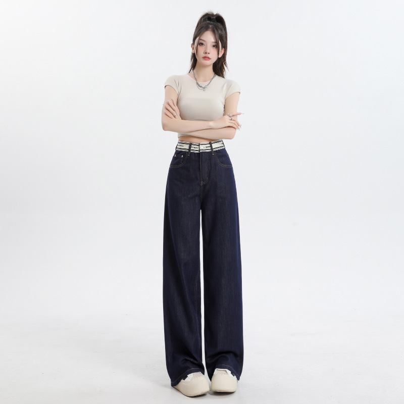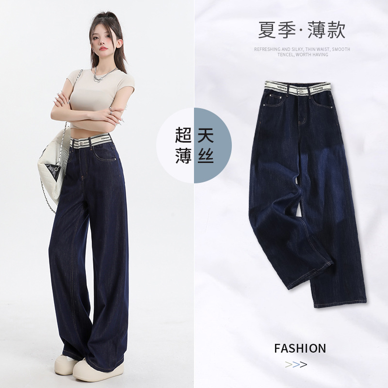 | nameOriginal | dark blue Ice Silk Straight Jeans Women's 2024 Summer Thin Stitching Letter Waist Dagging Wide Leg Trousers |