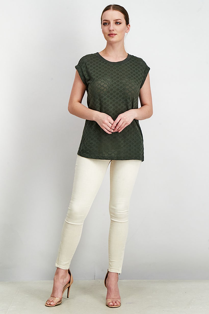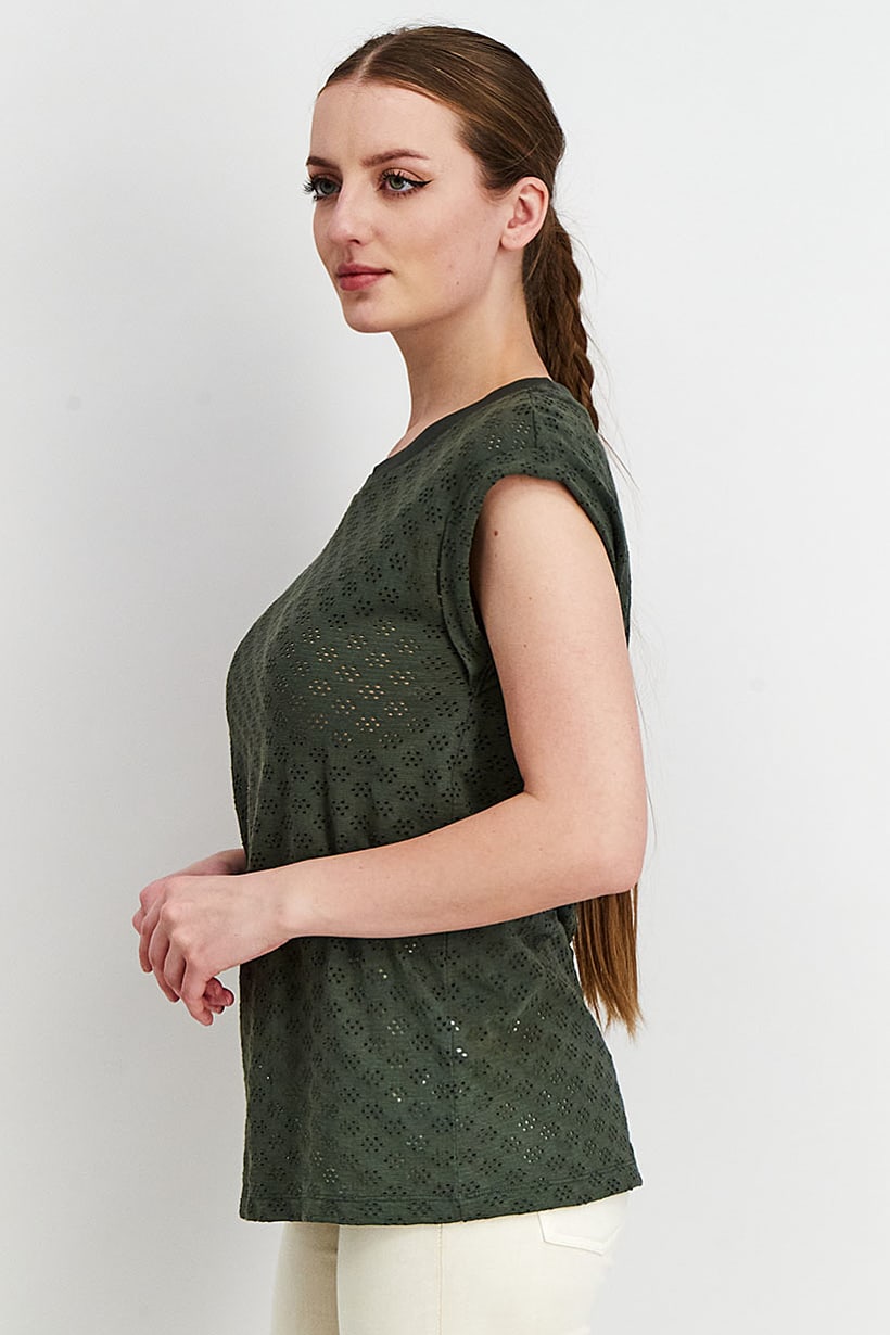 | nameOriginal | Women Boat Neck Cuffed Sleeve Eyelet Top, Dark Green |