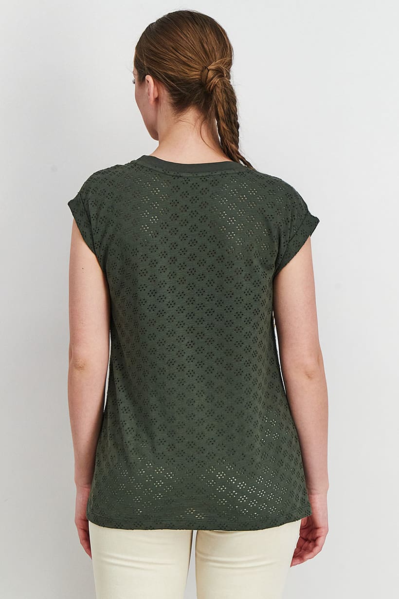 This blouse is made of 100% cotton and is machine washable for easy care. It has a regular fit and a straight hem, with a boat neckline and cuffed sleeves. The top is a pullover style and features an eyelet pattern in a green color family, making it perfect for casual occasions. The size shown is international.