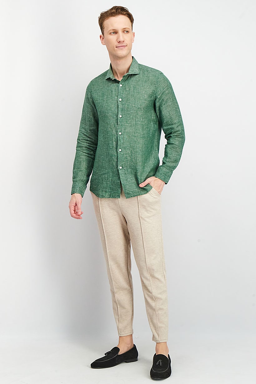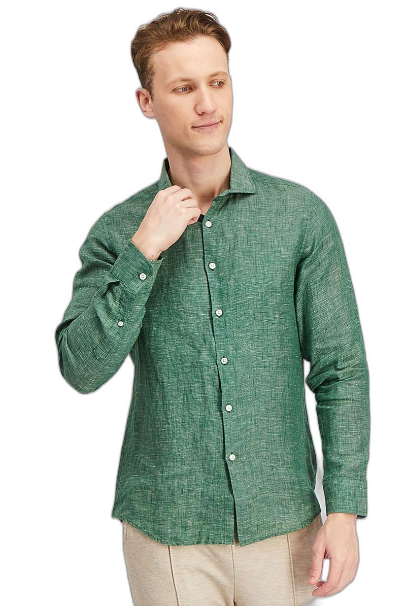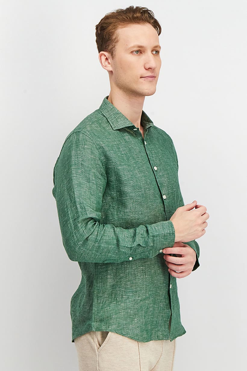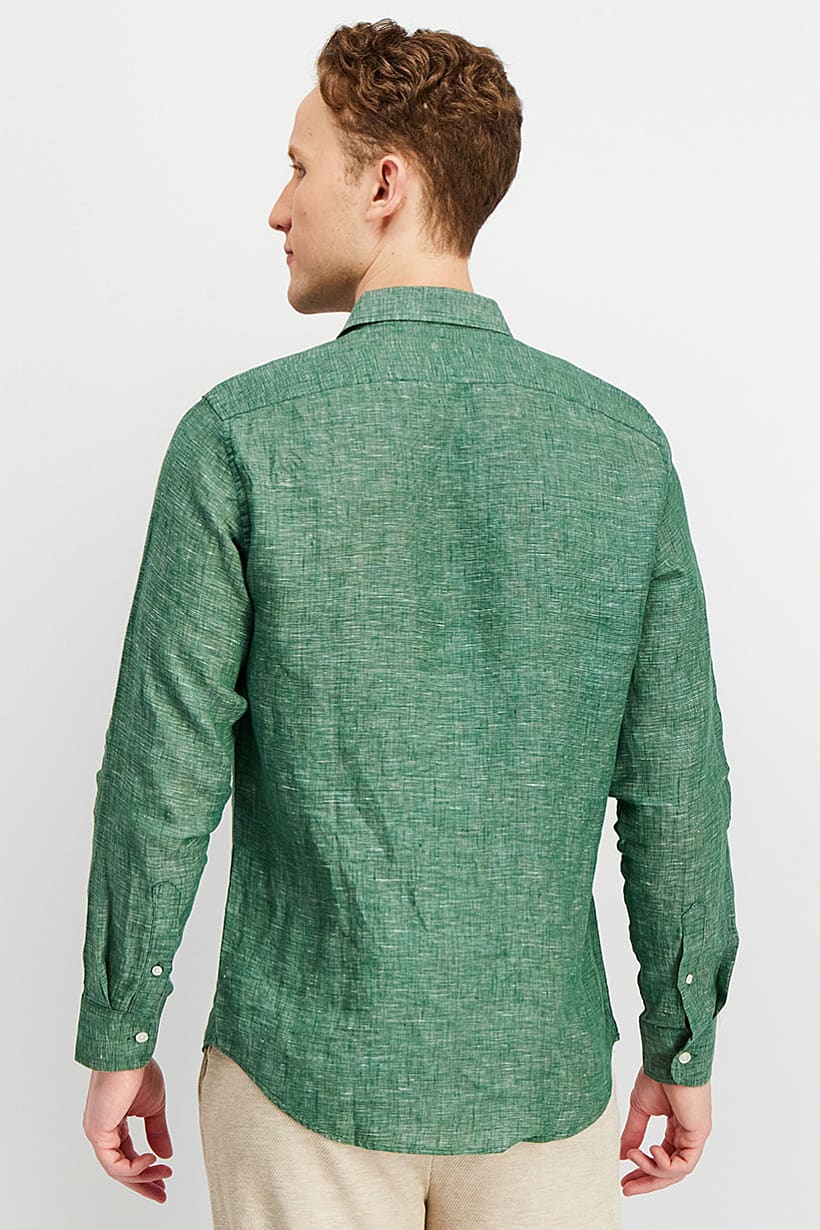 Care : Hand wash, Fit : Regular fit, Size shown : International, Sleeve Length : Long Sleeve, Types of Hem : Slit hem, Types of Neckline & Collar : Spread collar , Disclaimer : Product color may slightly vary due to photographic lighting sources or your monitor settings., Fabrics : 55% Linen, 45% Cotton, Occasion : Casual, Pattern & Print : Textured pattern, Types of Closures : Button, Color Family : Green,