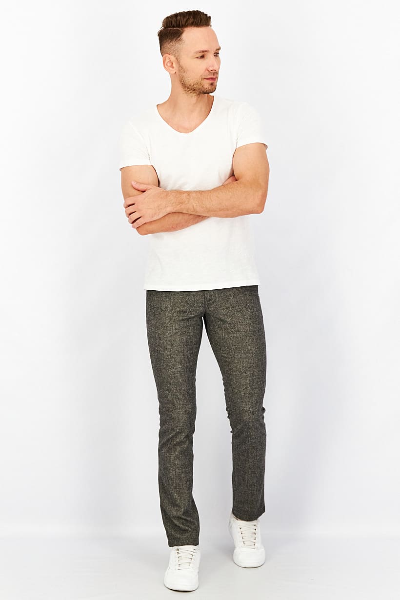 Care : Machine washable, Fit : Straight, No of pockets : 4, Pant Style : Chino, Size shown : Inches, Stretch Type : Stretchable, Types of Jeans Rise : Mid rise, Bottom Closure : Button, Bottom Style/Pattern : Four pocket style, Disclaimer : Product color may slightly vary due to photographic lighting sources or your monitor settings., Fabrics : 52% Cotton, 29% Polyester, 16% Viscose, 3% Elastane, Occasion : Casual, Pattern & Print : Heather, Color Family : Grey,